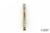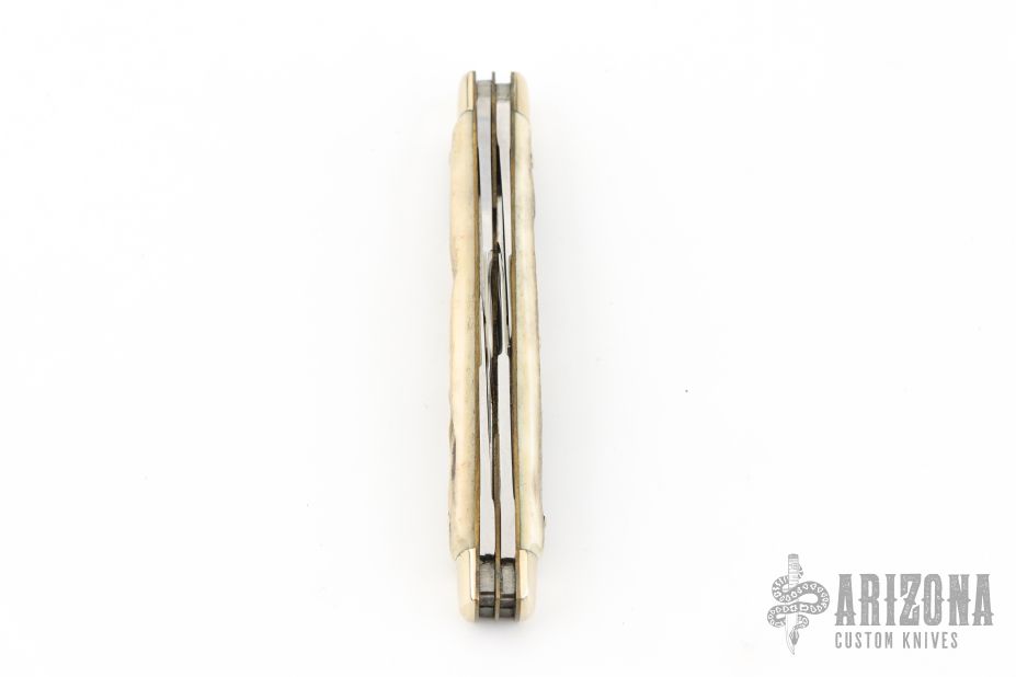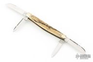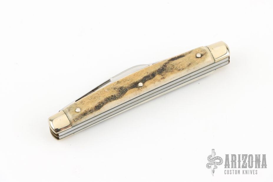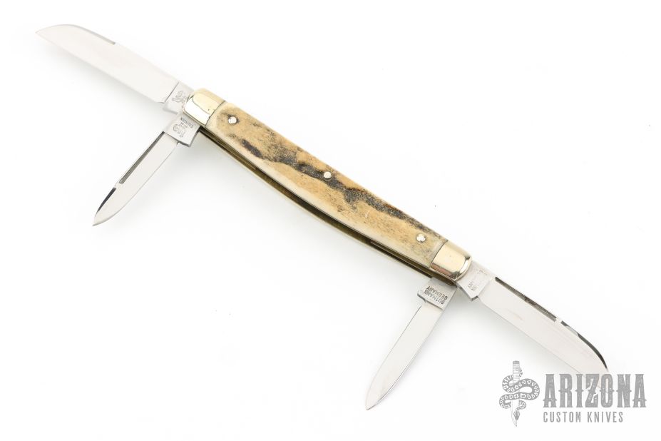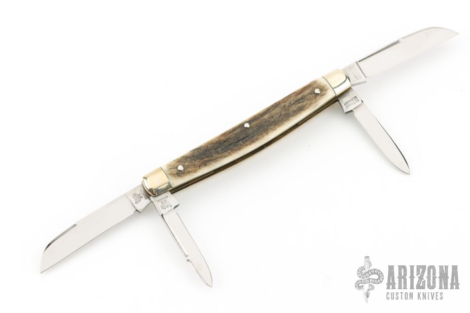 This 4-blade congress by Hen and Rooster features mirror polished blades with nail nicks. The handle has nickel silver bolsters, stag covers, brass liners and stainless steel springs. Has half-stops. Has some light scratches, otherwise excellent condition.