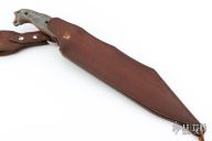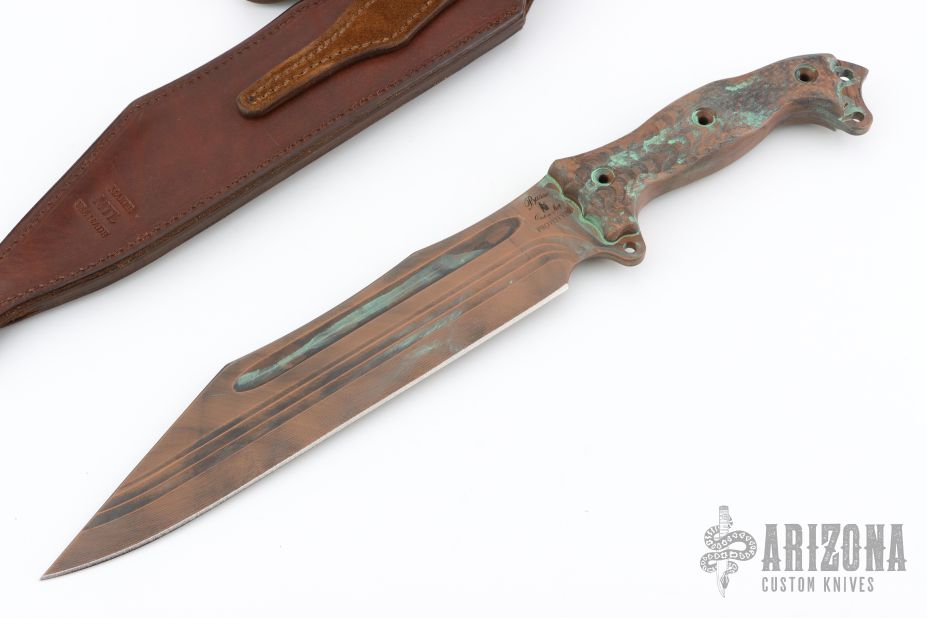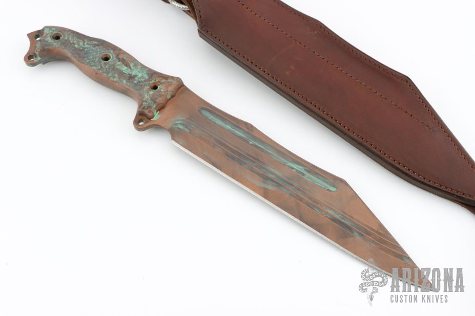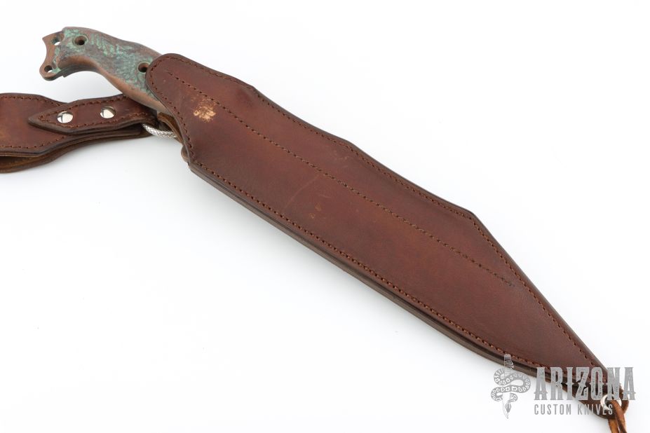This Seax Prototype by Busse features a antique bonze finished INFI blade with corrugated bevel technology and fullers, .231" blade stock and 2.118" blade depth, full tang construction. The handle has canvas micarta scales, extended tang with lanyard holes. Excellent condition. Comes with a custom leather sheath by MTL