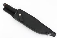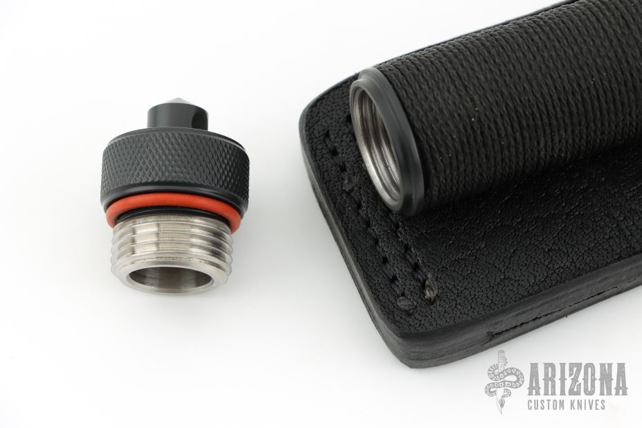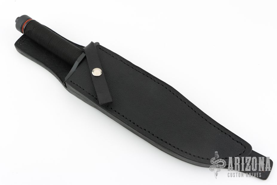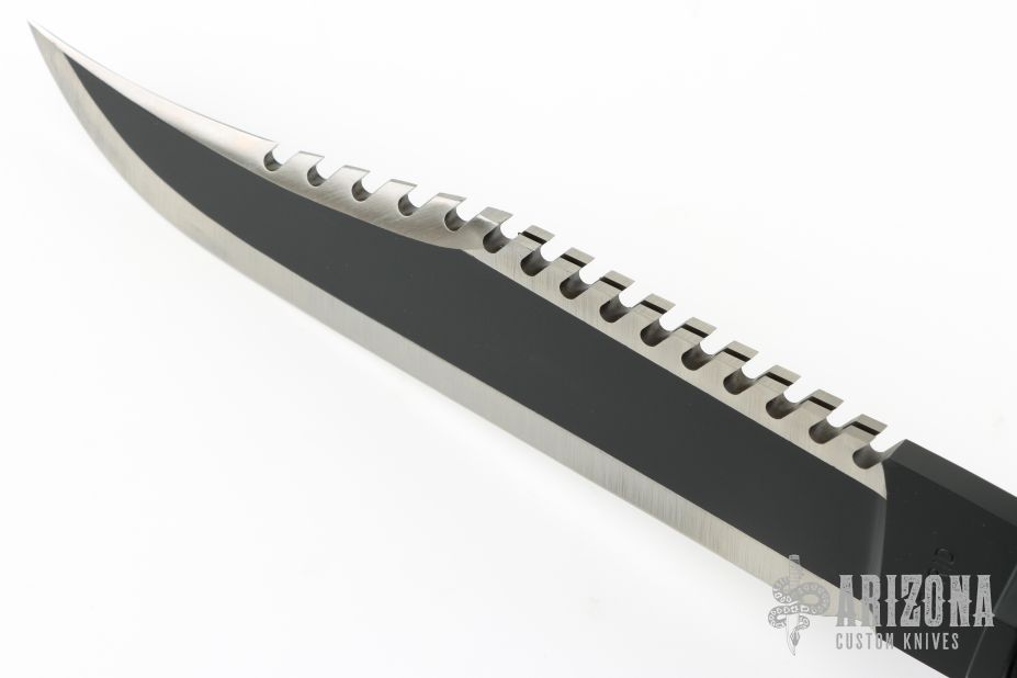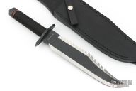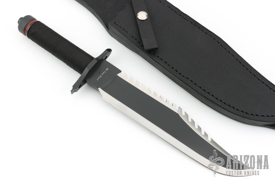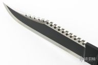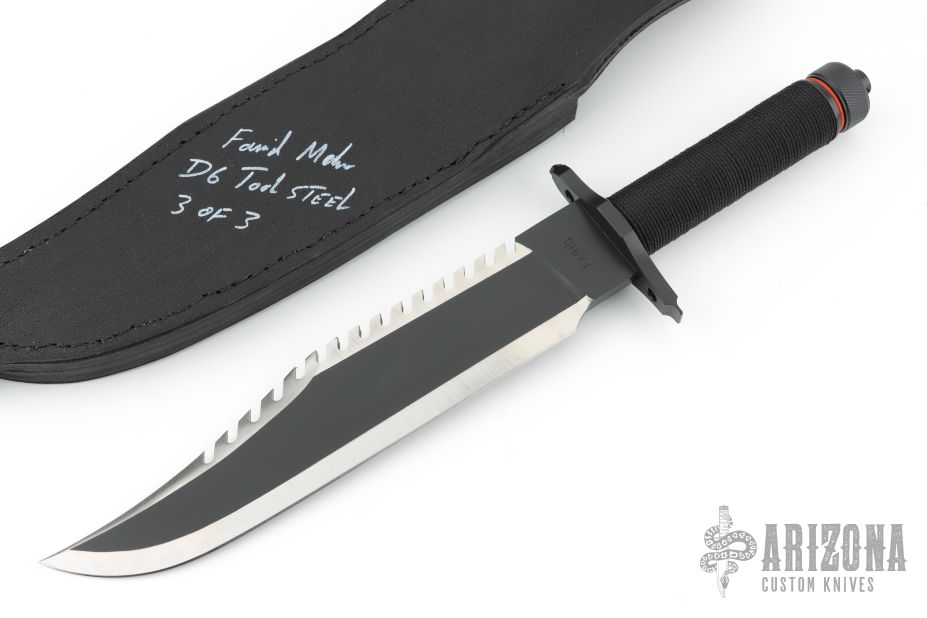 This Rambo Mission knife by Farid Mehr features a two-tone black/satin blade with 9 double split teeth and 5 single teeth, sharpened top edge, .318" blade stock and 1.916" blade depth, hidden tang construction. The blade is 60RC, the ricasso and tang are differentially tempered to be tougher. The guard is black 440C stainless steel. Nylon covered and hollowed out 303 stainless steel handle with a black knurled 303 stainless steel butt cap. Stamped "FARID" on front side of blade and "D6 Tool Steel" and "3-3" on back side of blade. Comes with a black leather sheath. New from maker. This knife is #3 of 3.