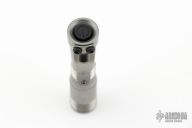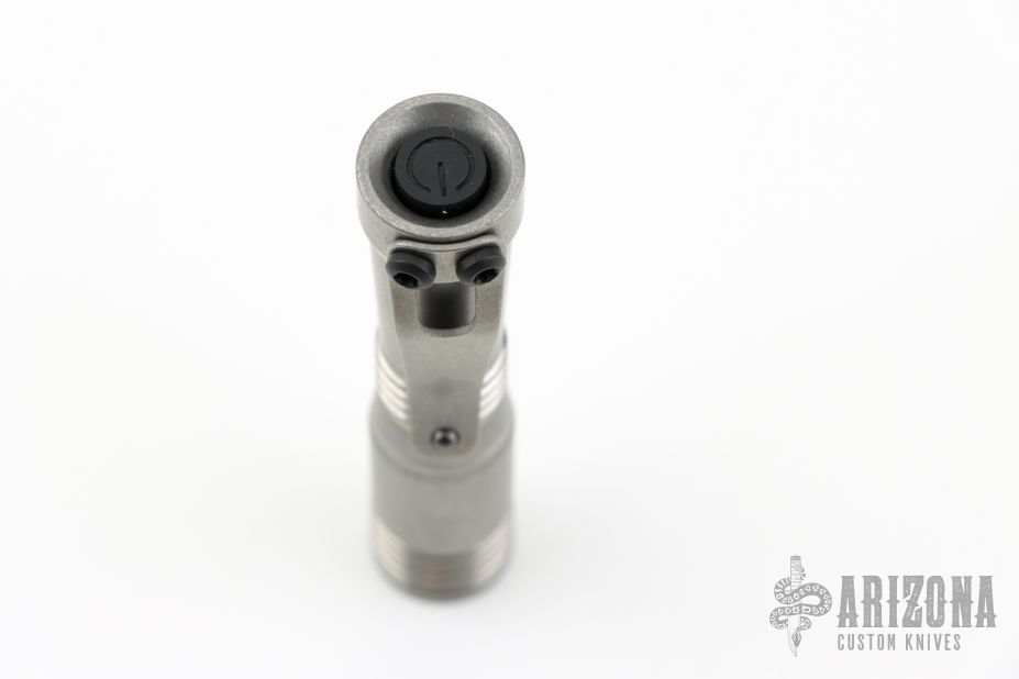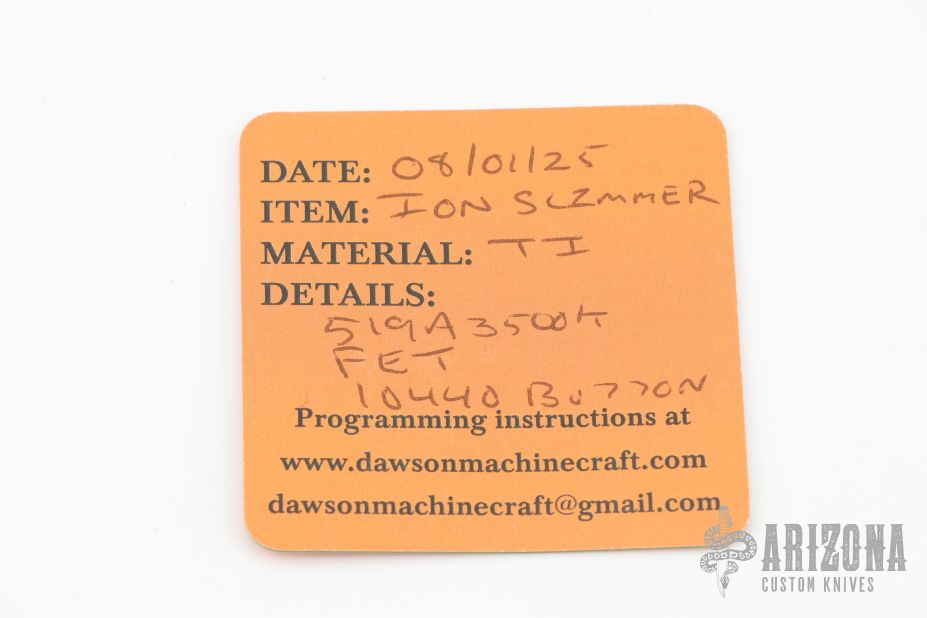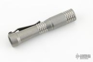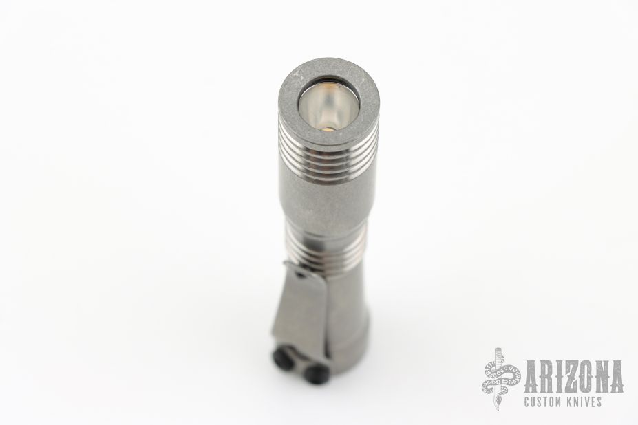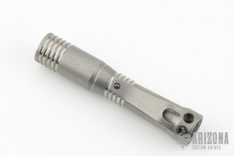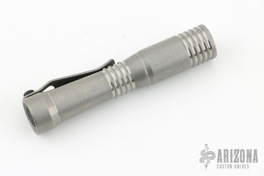 This Ion Slimmer flashlight from Mitch Lum/Laulima Metal Craft and Joshua Dawson features a titanium body. 519A 3500K Emitter. Reflector optic. Mineral window. Uses a single 14500 battery. Battery is not included.  Titanium Pocket clip.  This piece comes with a custom pouch and COA.  New From Maker.