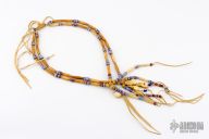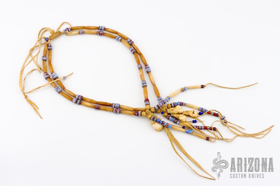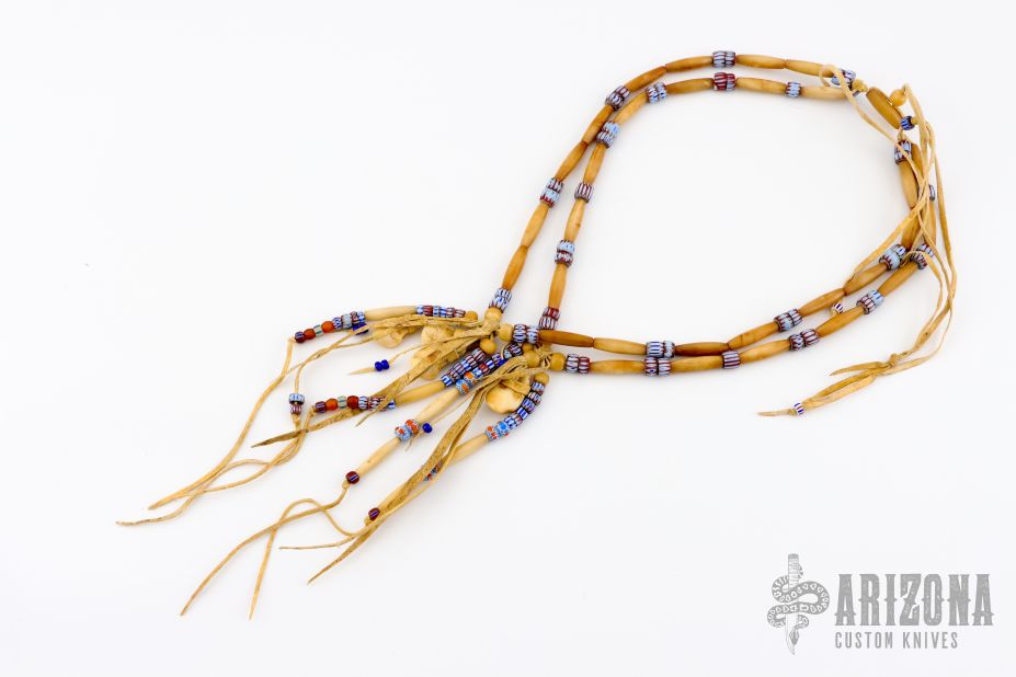 This necklace by C.O. Pawling is made with Brain-tanned leather, bone hair pipe, trade beads, tin cone, and four elk teeth. A one of a kind necklace with 20" drape. Comes with COA. New from maker.