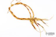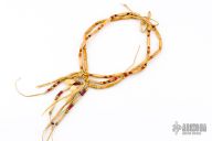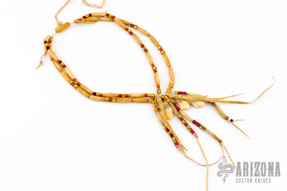 This necklace by C.O. Pawling is made with Brain-tanned leather, bone hair pipe, trade beads, and three elk teeth. A one of a kind necklace with 18" drape. Comes with COA. New from maker.