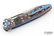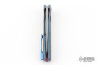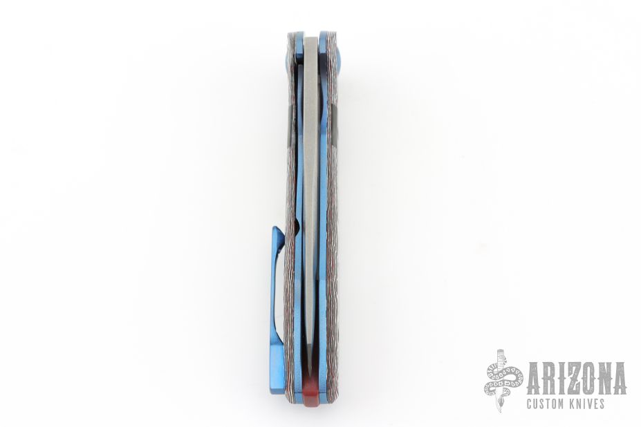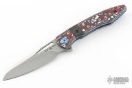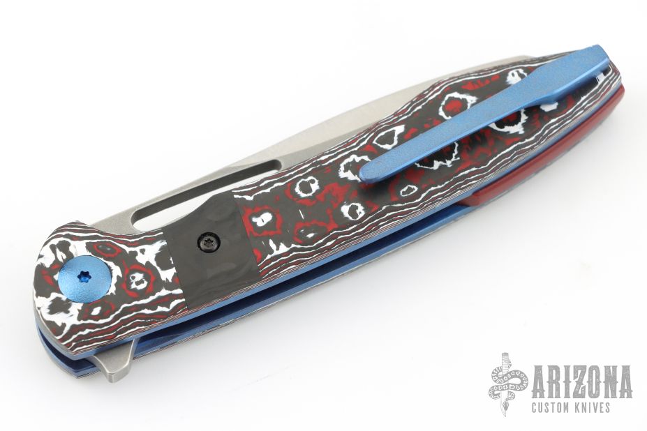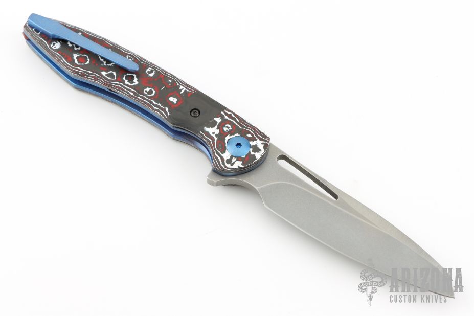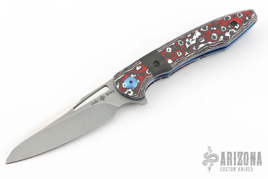 This knife by Eric Ochs features a tumbled sheepsfoot blade. The handle has fat carbon scales over anodized titanium liners with a matching tip-up pocket clip. Bake-O-Lite backspacer. Includes a padded zippered case and COA. New from maker!