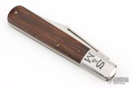 This Grand Daddy Barlow by Schatt & Morgan features a satin finished blade with nail nick. The handle has nickel silver bolsters, wood covers, nickel silver liners and stainless steel spring. Has half-stop. Has some light scratches, otherwise excellent condition.