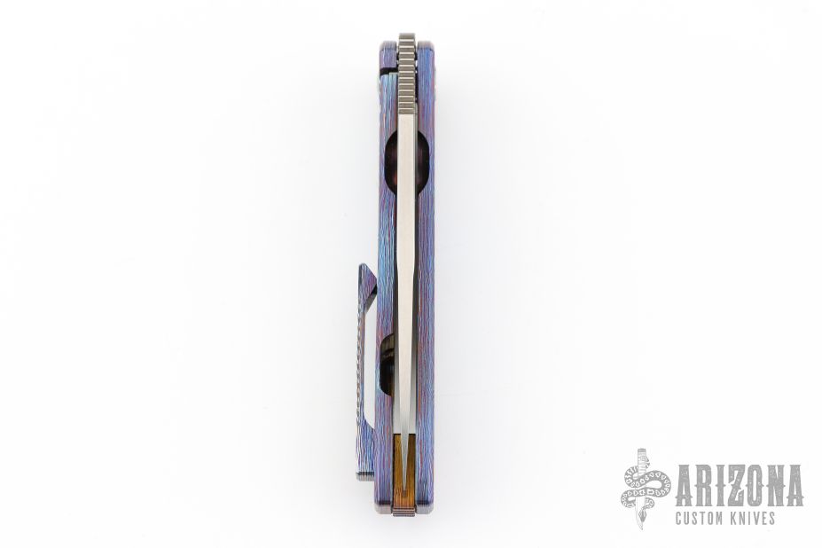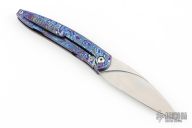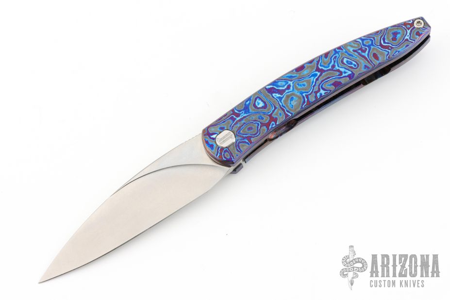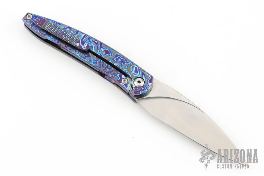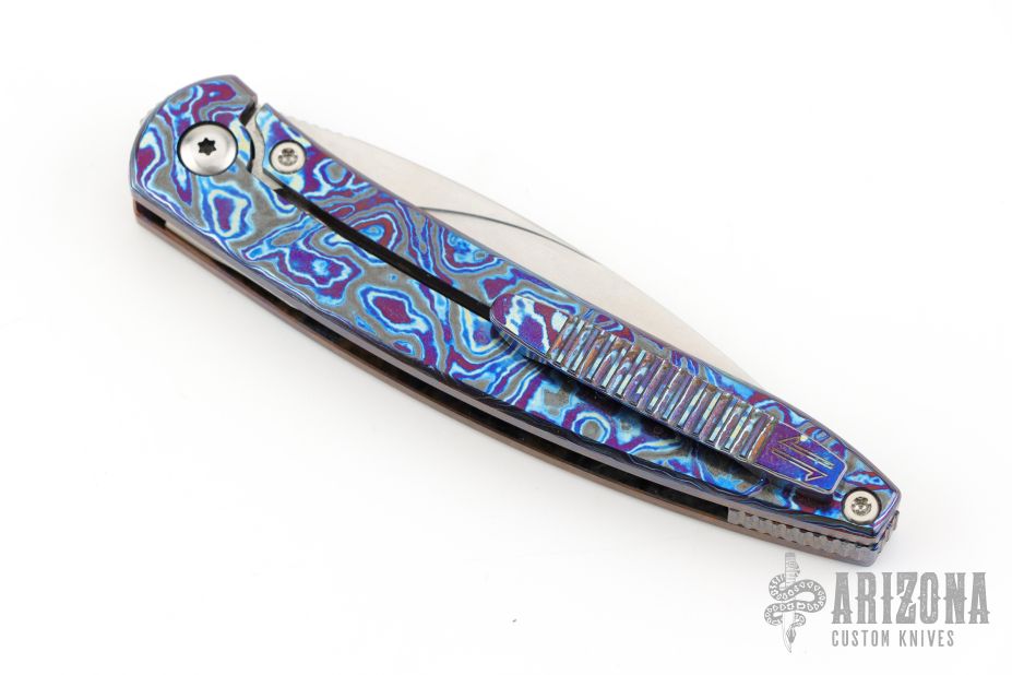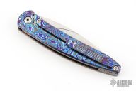 This Exponent by Craig Brown Knives features a drop point stonewash finished blade and notched thumbrest and front flipper. The handle has a Black Timascus frame with matching tip up and backspacer. Nice detent, action, blade seating and lock up. Comes with original hard case with certificate #128. Excellent condition.