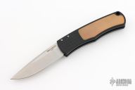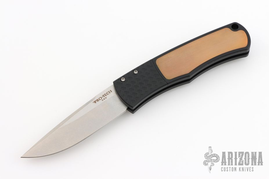 This Magic BR-1 Bolster Release Automatic from Pro-Tech Knives features a drop point stonewashed 154-CM blade with swedge. The handle features a black aluminum frame with checkered bolster and copper inlay on the "A" side of the handle. Black coated stainless steel clip is positioned for tip up carry. Lanyard hole in the pommel.  Includes the original box and papers.  Excellent Condition. PR4#248