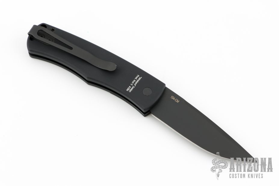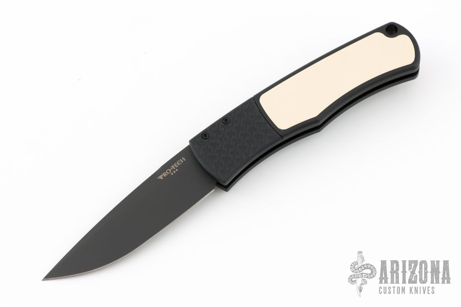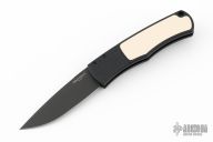 This Magic BR-1 Bolster Release Automatic from Pro-Tech Knives features a drop point black 154-CM blade with swedge. The handle features a black aluminum frame with checkered bolster and ivory paper micarta inlay on the "A" side of the handle. Black coated stainless steel clip is positioned for tip up carry. Lanyard hole in the pommel. Comes with original box and papers. Excellent condition.