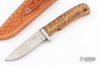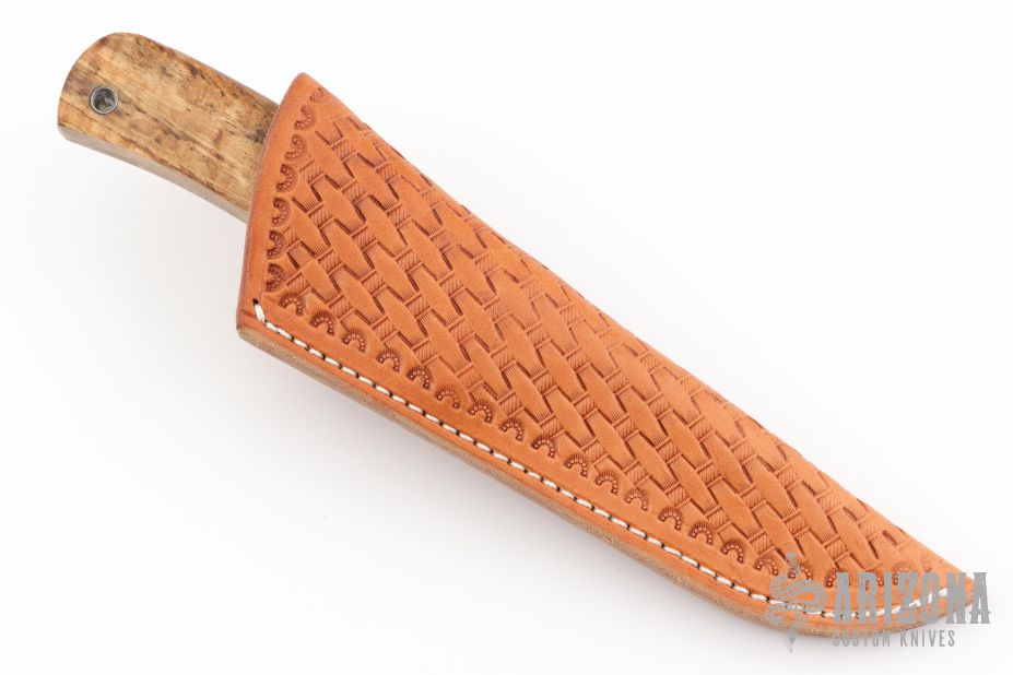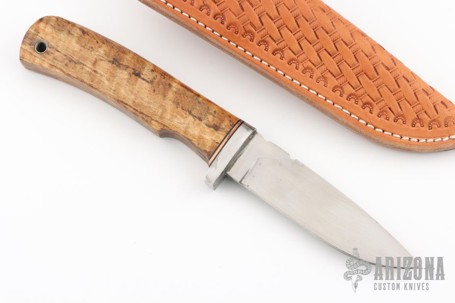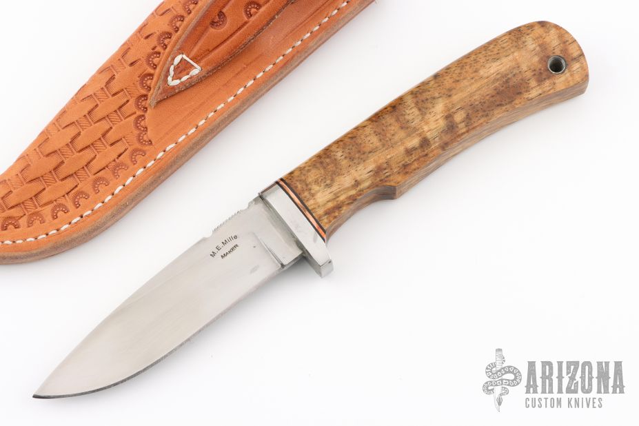 This knife by Michael E. Miller features a satin finished drop point blade with a hidden tang construction.  .191" Blade Stock.  1.046" Blade Depth.  The handle features a steel guard, copper/black spacers, and a stabilized mango wood grip. Includes a brown hand-tooled leather sheath and Maker's card. New from maker!