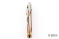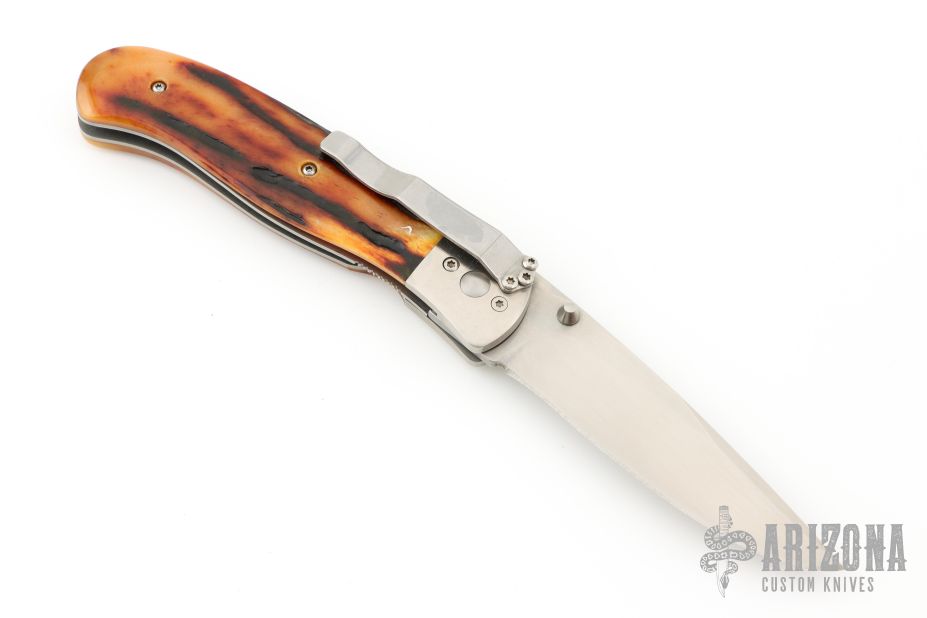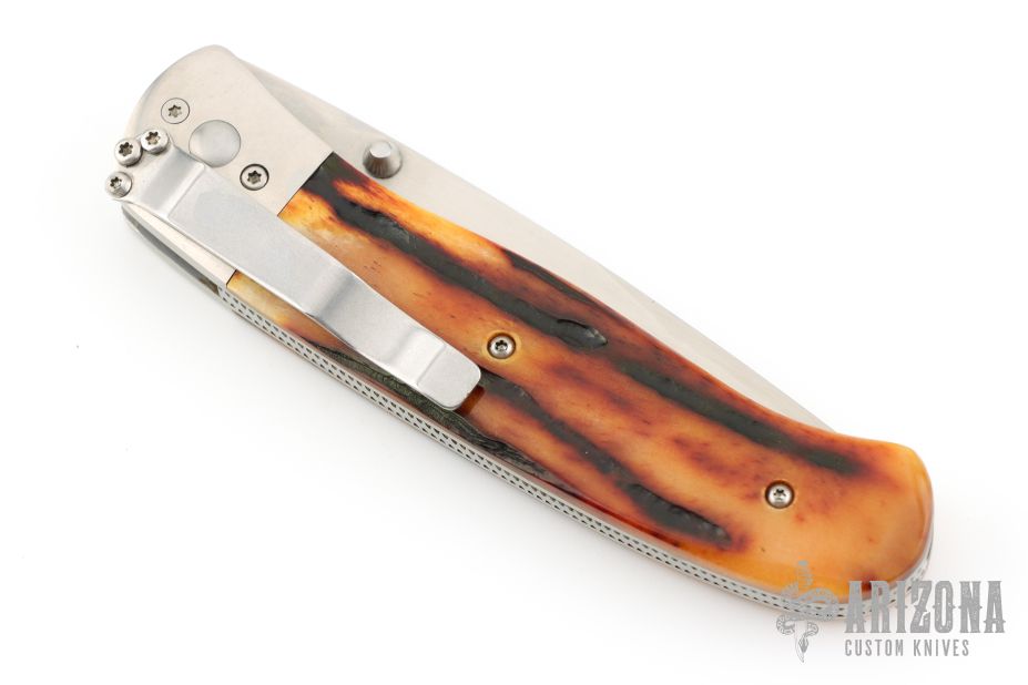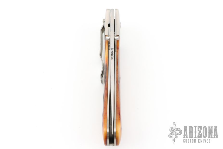 This Linerlock Folder from Don Norris features a hand rub satin finish drop point blade with swedge and dual thumb studs. The handle is comprised of titanium bolsters and jigged bone scales over file worked backspacer and steel liners. Tumbled/polished stainless steel tip down clip. Comes in a soft pouch. Has some scuffs and scratches, great condition otherwise.