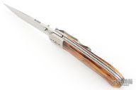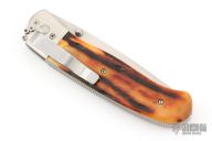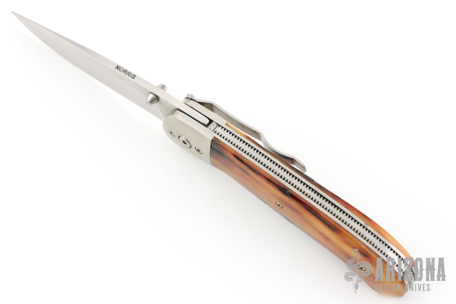 Don Norris specialized in classic and traditional styles, producing both working and exhibition knives, often in a Bowie style. A perfectionist, he found knife making exhilarating and embraced each artistic challenge with gusto! He loved putting together unique and beautiful materials to create an elegant statement piece, often enhanced with a Francine catalog etching or the occasional custom etching. Don passed away in 2008.