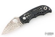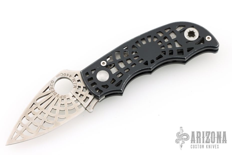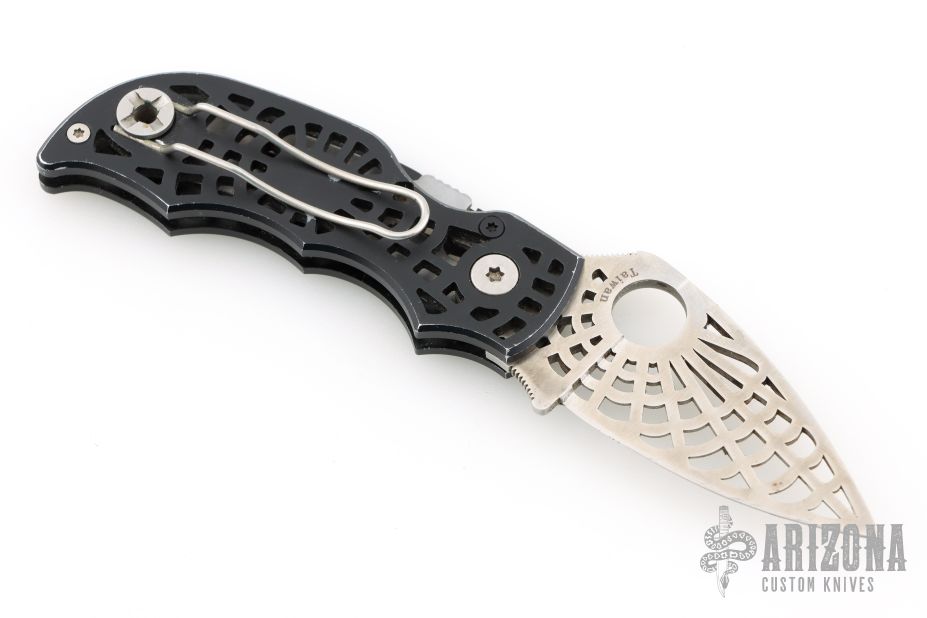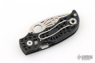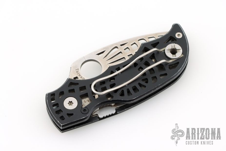 This "S" by Spyderco features a satin finished skeletonized blade with notched thumb and finger rests. The handle has a black aluminum frame with a single stainless steel liner, tip up stainless steel clip. Has some scuffs and scratches, great condition otherwise.