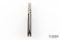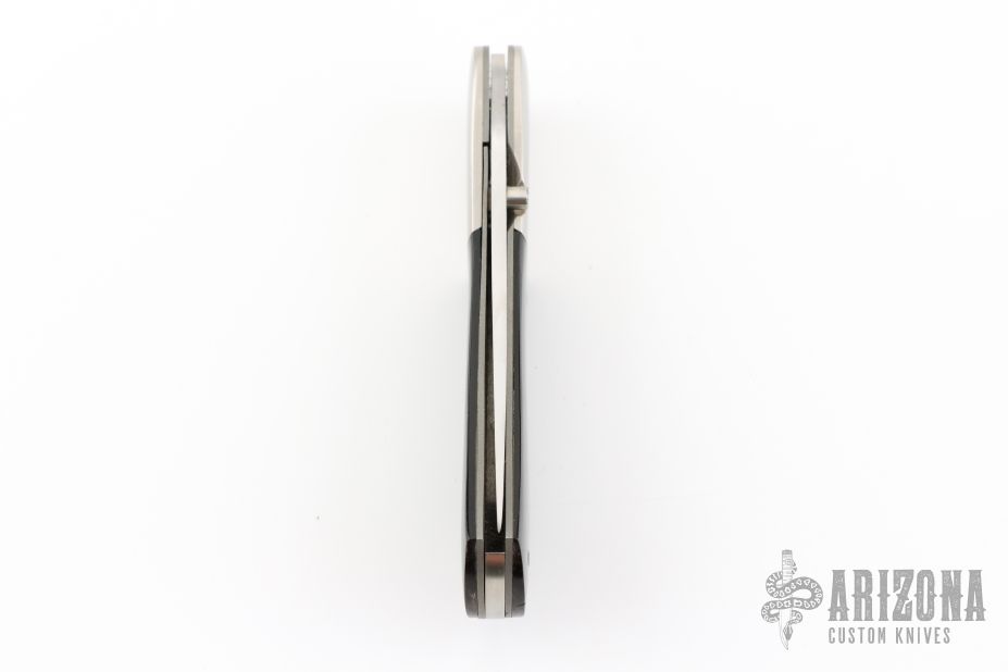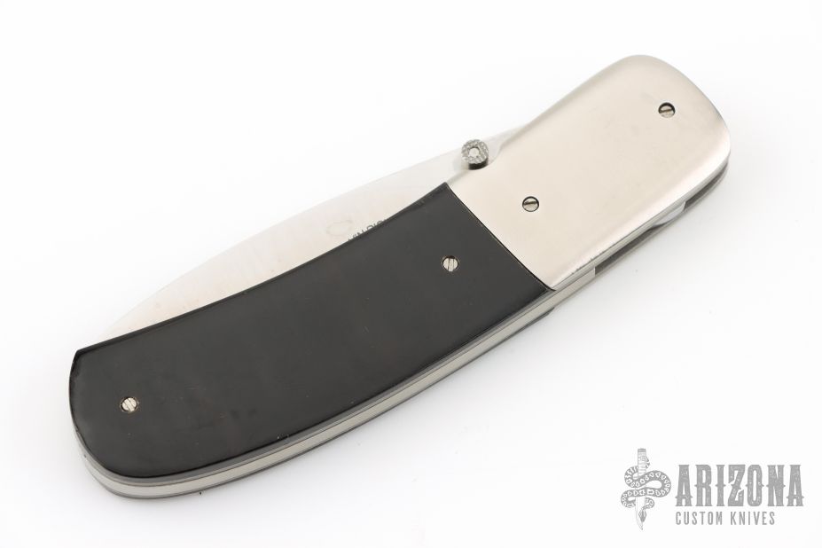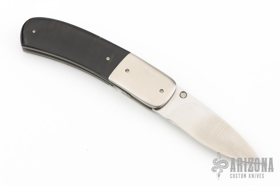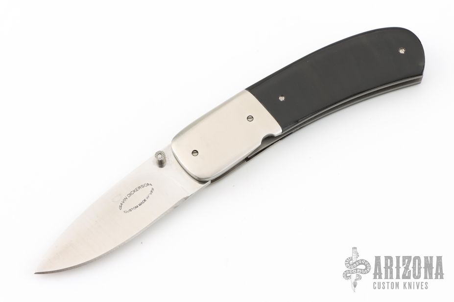 This linerlock folder from Gavin Dickerson features a satin finished stainless steel drop point blade with checkered right hand thumbstud. The handle is comprised of nickel silver bolsters, bead blast titanium liners, and buffalo horn scales over steel backspacer. Has some blade play and is slightly off-center. Has some scuffs and scratches, good condition otherwise.