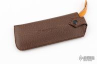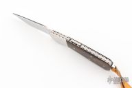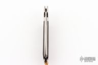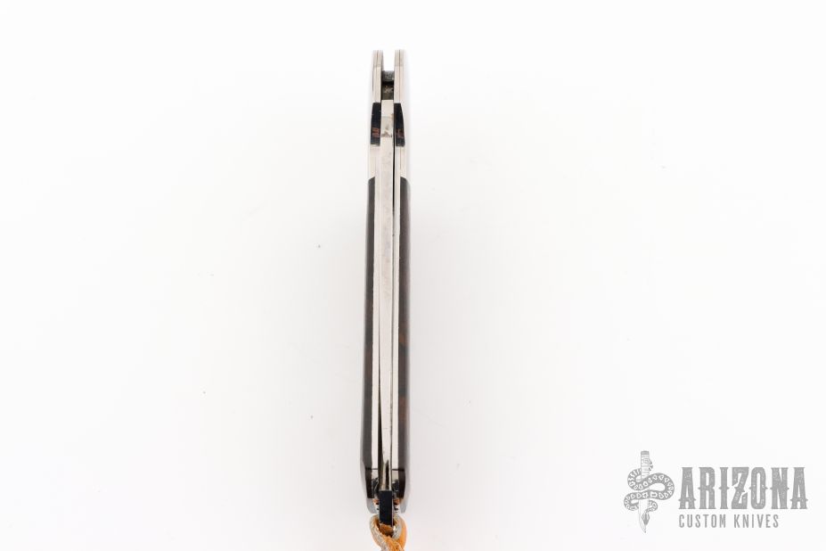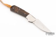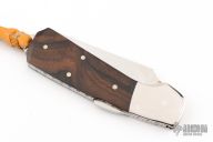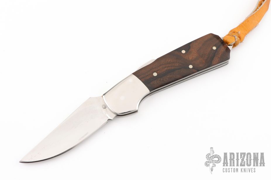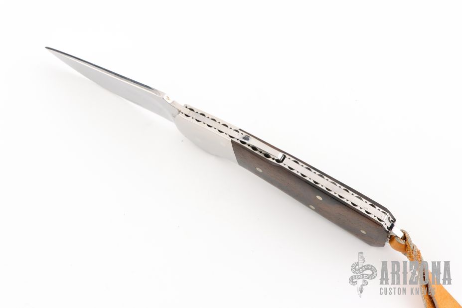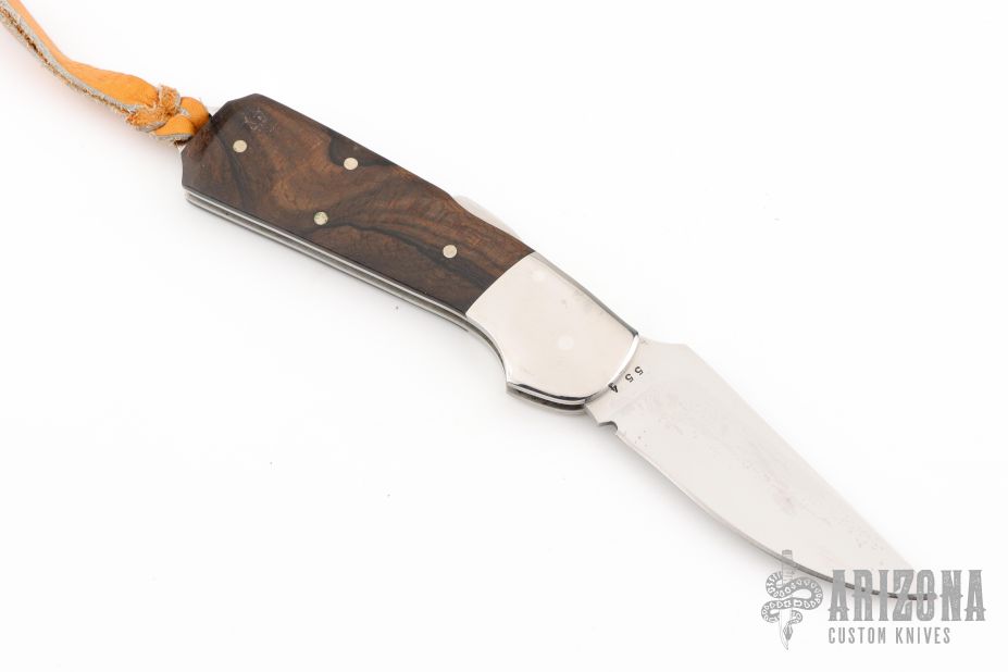 This lockback by Bob Jones features a mirror polished clip point blade with a full face hollow grind. The handle features steel dovetail bolsters, file worked liners, wood covers, and steel backstrap. Comes in a soft pouch. Has some light scuffs and scratches, great condition otherwise. #554