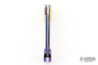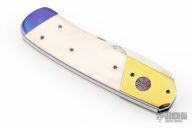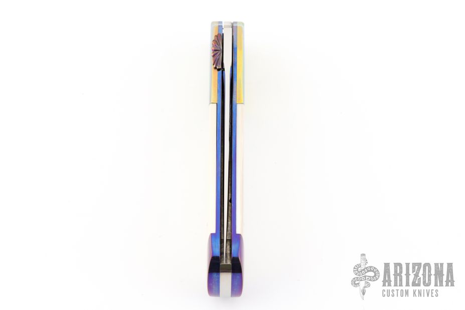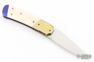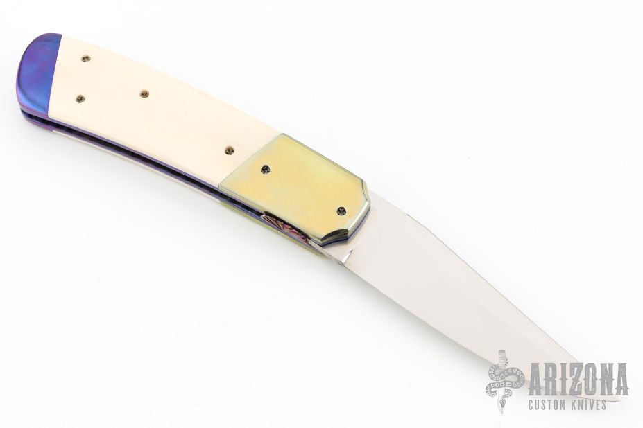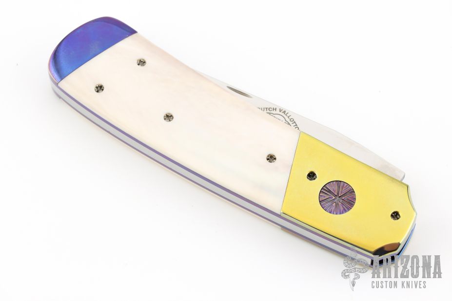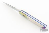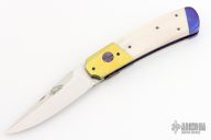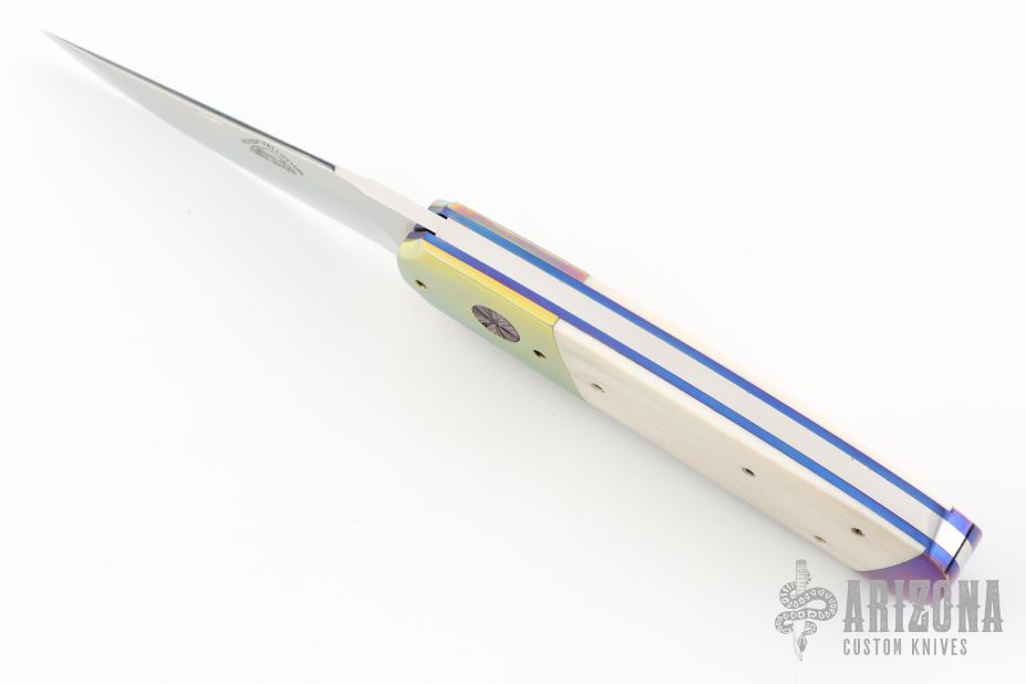 This D/A Automatic by Butch Vallotton features a mirror finished drop point blade with nail nick and swedge. The handle has anodized titanium bolsters, bone scales, anodized titanium liners with jeweled interiors, polished backspacer. Nice lockup and action. Comes in a zipper case with info card. Has a couple light scratches, otherwise excellent condition.