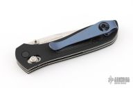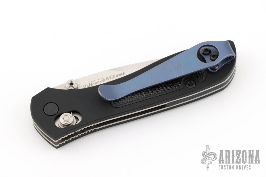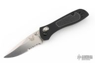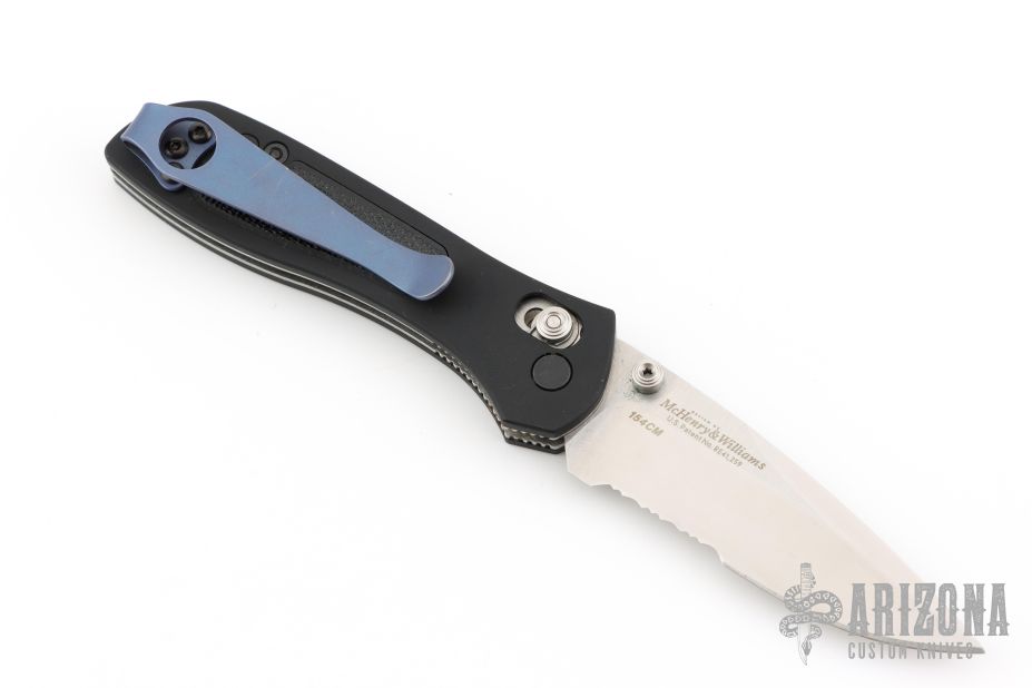 This 707 from Benchmade features a satin finished spear point blade with dual thumbstuds, serrations and a false top edge. The handle has anodized aluminum scales and black G-10 inserts, stainless steel liners, and a black backspacer. Tip up reversible stainless steel clip. Comes with original box, pouch and papers. Has aftermarket deep carry clip, listing includes original clip. Has a couple light scuffs and scratches, excellent condition otherwise.