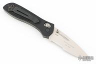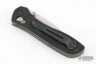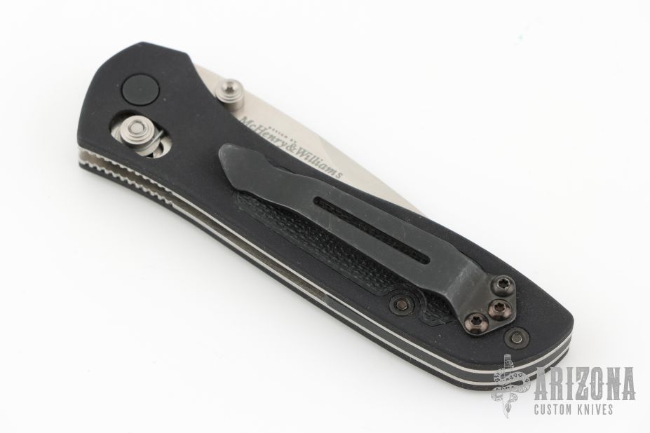 This 707 from Benchmade features a stonewash spear point blade with dual thumbstuds and a false top edge with serrations. The handle has anodized aluminum scales and black G-10 inserts, stainless steel liners, and a black backspacer. Tip up reversible stainless steel clip. Comes with original box, papers, and pouch. Has some light scuffs otherwise excellent condition.