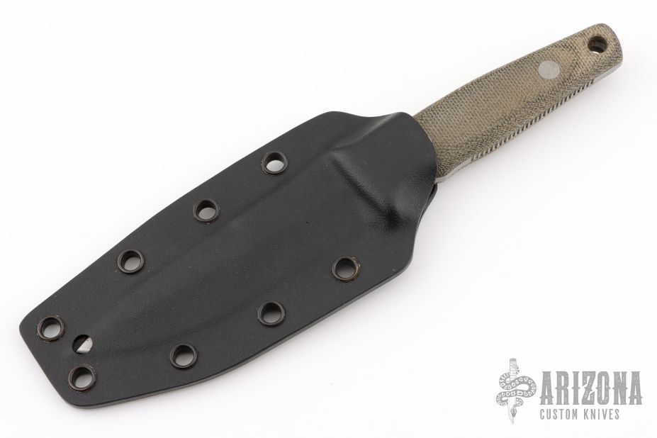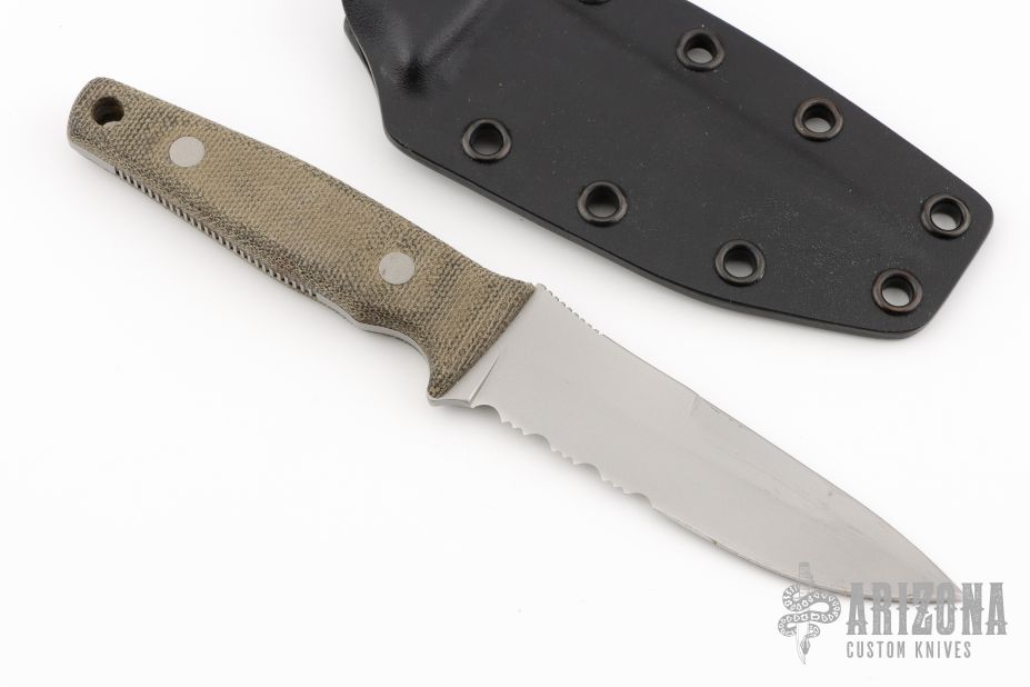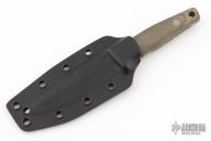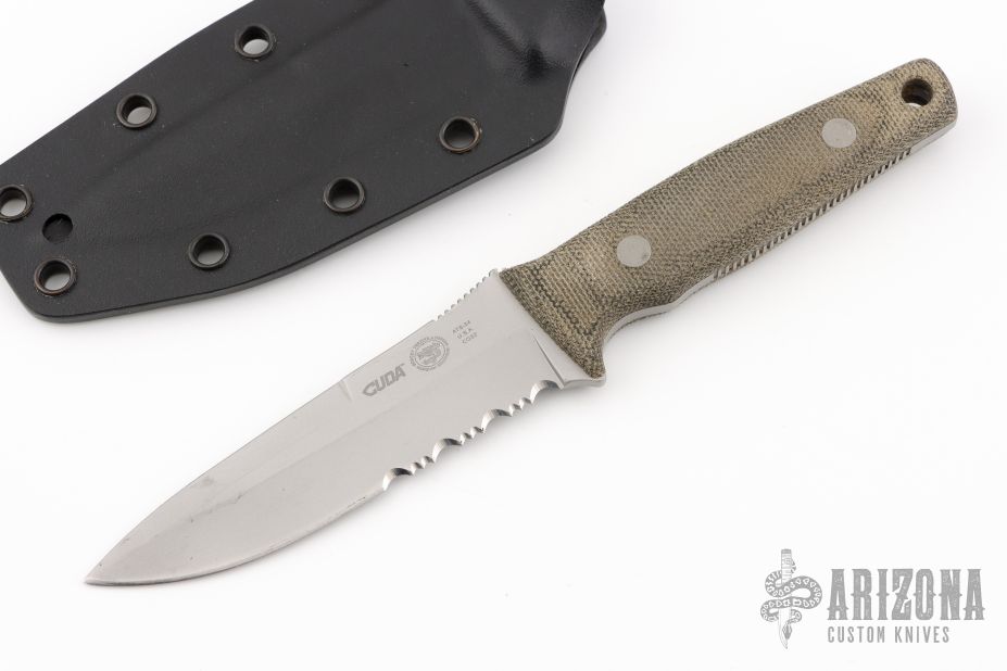 This Cuda CQB2 is a Bob Terzuola design executed by Camillus. It features a bead blasted spear point blade with serrations, false top edge, notched thumb ramp, .122" blade stock and 1.133" blade depth, full tang construction. The handle is comprised of green canvas micarta scales with lanyard hole over notched tang. Comes with original Kydex sheath. Has some light scuffs and scratches, great condition otherwise.