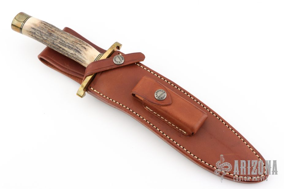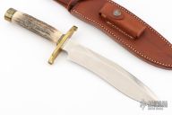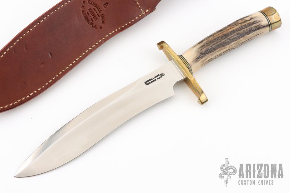 This Sasquatch by Randall Made Knives features a satin finished recurve blade with sharpened top edge, .206" blade stock and 1.423" blade depth, hidden tang construction. The handle has a lugged brass guard, brass butt, and a stag grip with black and brass spacers. Comes with original sheath. Has some light scratches, excellent condition.