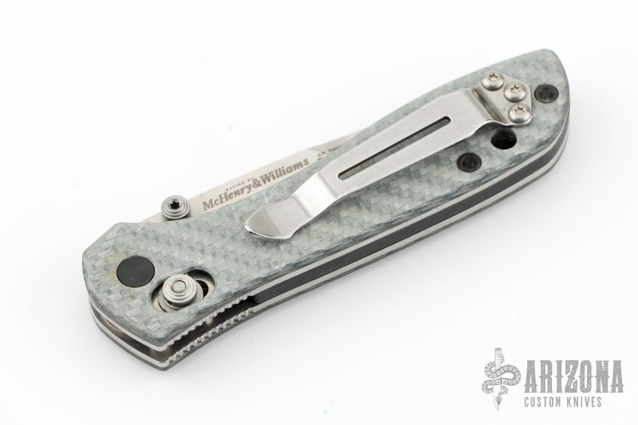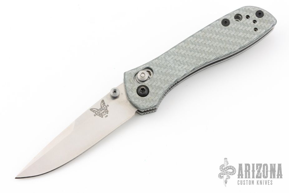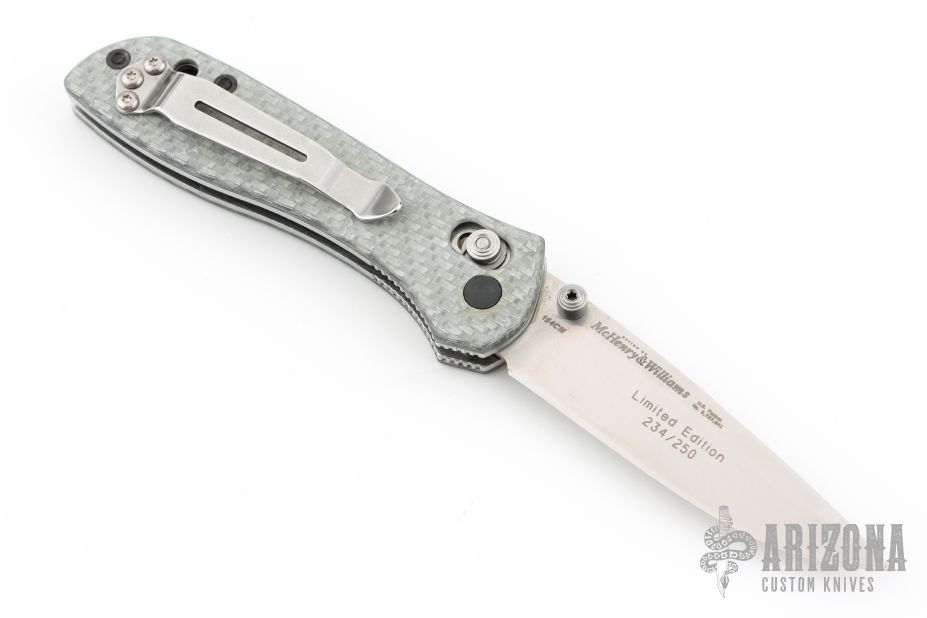 This knife by Benchmade features a satin finished 154CM blade with dual thumbstuds. The handle has silver twill scales with stainless steel liners and black tip up reversible clip. "Limited Edition 234/250" on the blade. Comes with original box and papers. Excellent condition.