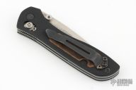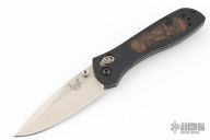 This Sequel by Benchmade features a satin finished drop point blade with swedge and dual thumb studs. The handle is comprised of black aluminum scales with wood inlays, over stainless steel liners and black backstrap. Black reversible tip up clip. Includes original box, and pouch. Has a couple light scuffs, otherwise Excellent condition.