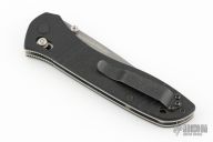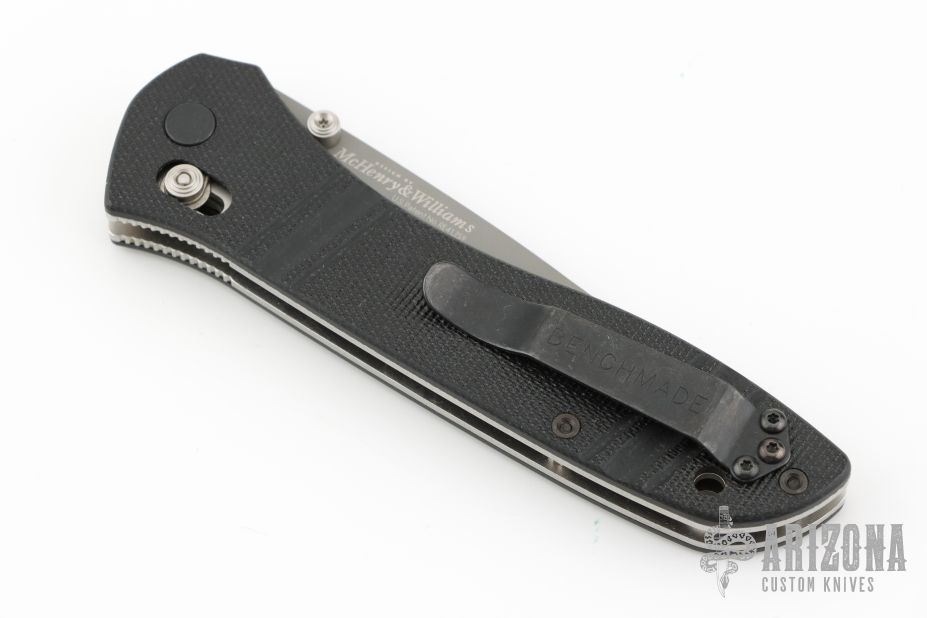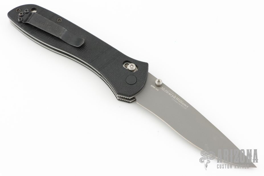 This Benchmade 710 McHenry has a bead blast finished drop point blade with dual thumb studs and crowned blade spine. Handle is black G10 with milled ribs, and black stainless steel tip up clip. Comes with original box, and drawstring pouch. Has a couple light scuffs, excellent condition otherwise.
