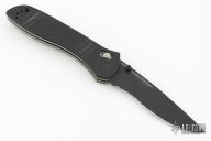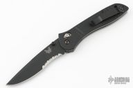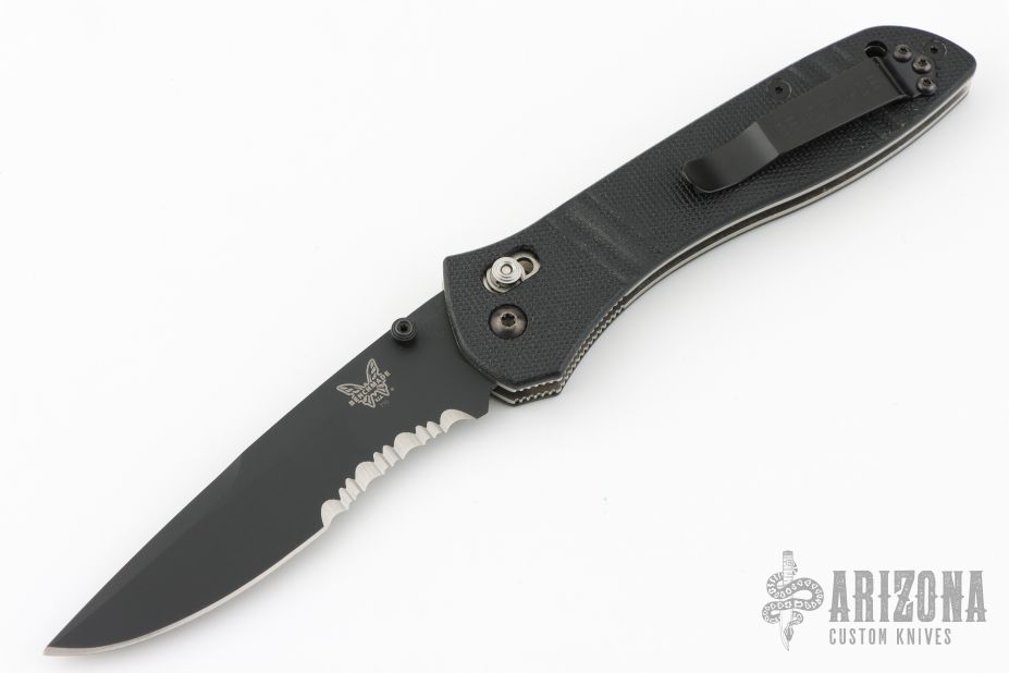 This 705 from Benchmade features a satin finished spear point blade with dual thumbstuds, serrations, and a false top edge. The handle has G10 covers, stainless steel liners, and a black backspacer. Tip up reversible black clip. Comes with original box, and papers. Has some scratches on the clip and some light scuffs on the body. Excellent condition.