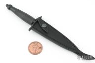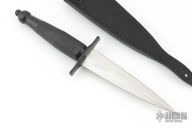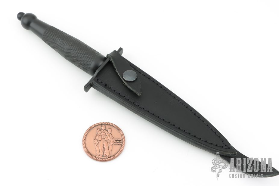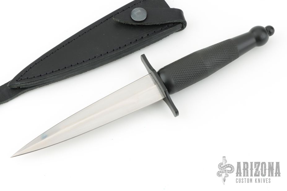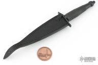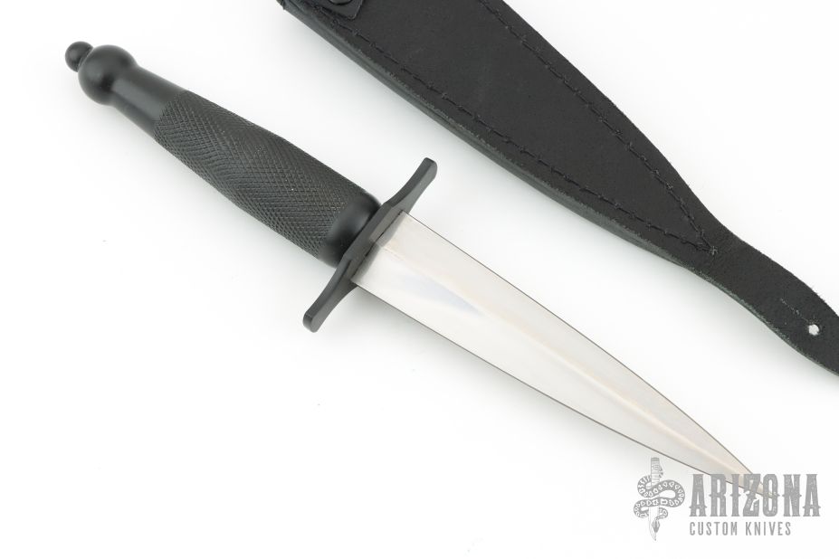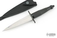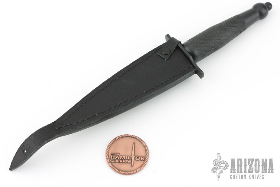 This Dagger by Hamilton Daggers Glasgow features a double edged satin finished blade with .188" blade stock and .854" blade depth, hidden tang construction. The handle has a steel guard and handle. Comes with a black leather sheath, original box and COA #17 of 20. Excellent condition.