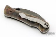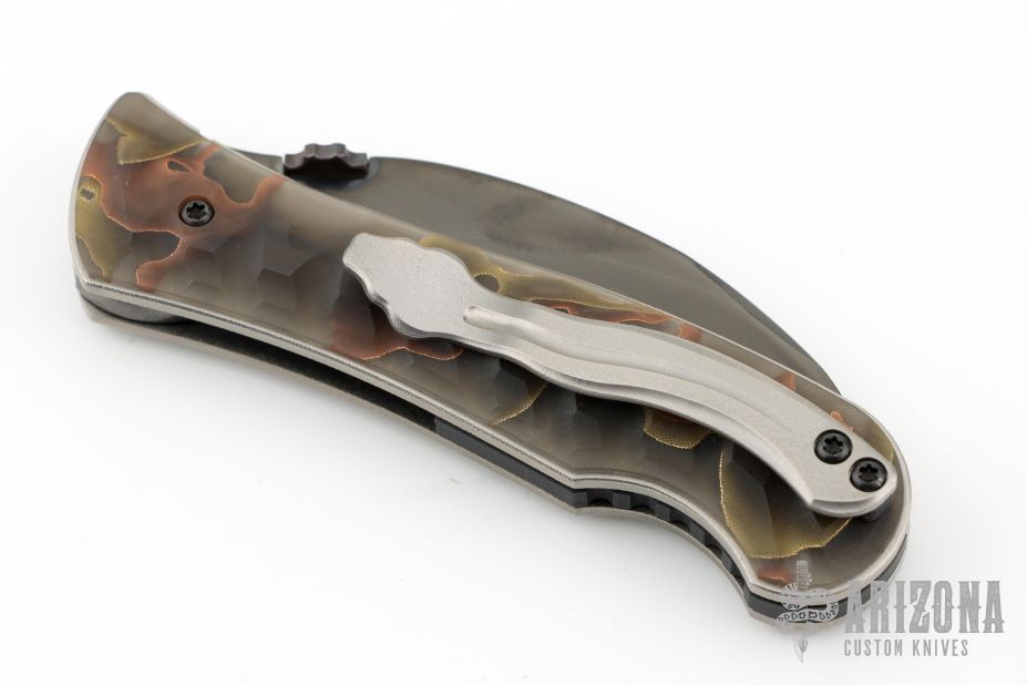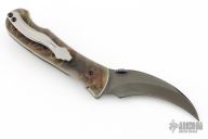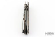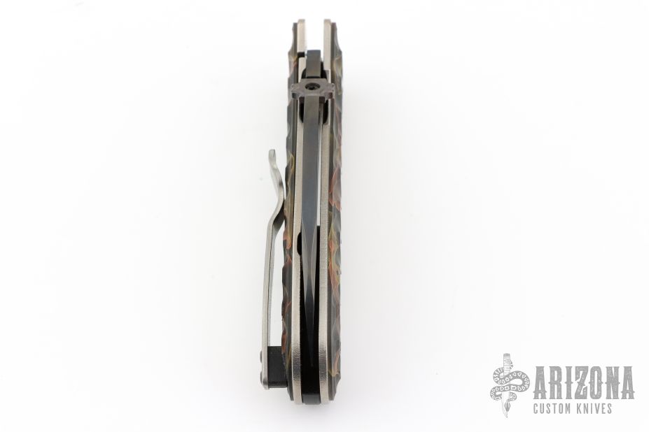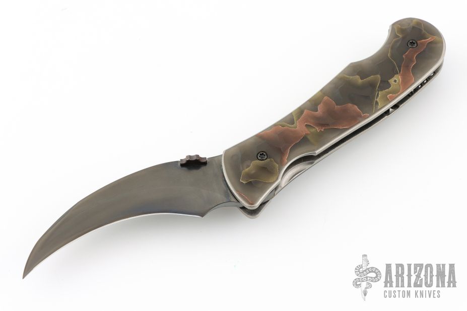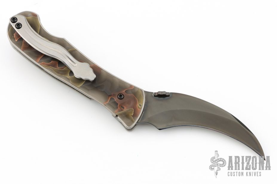This Elvia Folder by Korth Cutlery features a DLC hawkbill blade with thumbdisc. The handle has Elforin scales, orange peel finished titanium liners and a tip up titanium clip with g10 backspacer. Comes with Velcro case, COA, and patch. Rides on IKBS, nice detent, lockup and blade seating. Excellent condition.