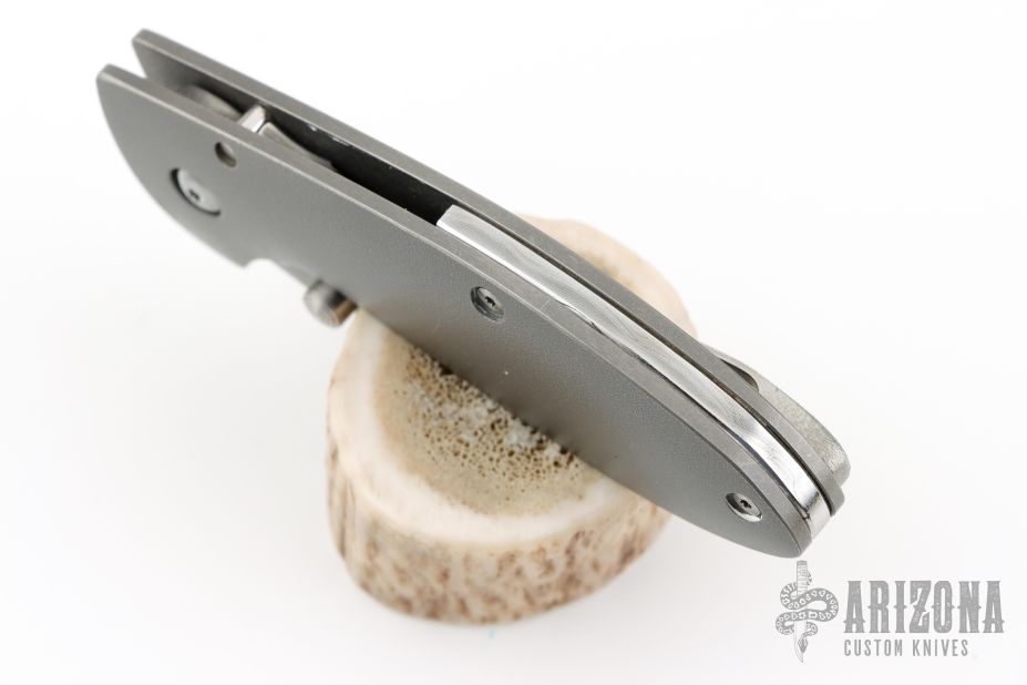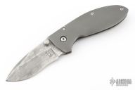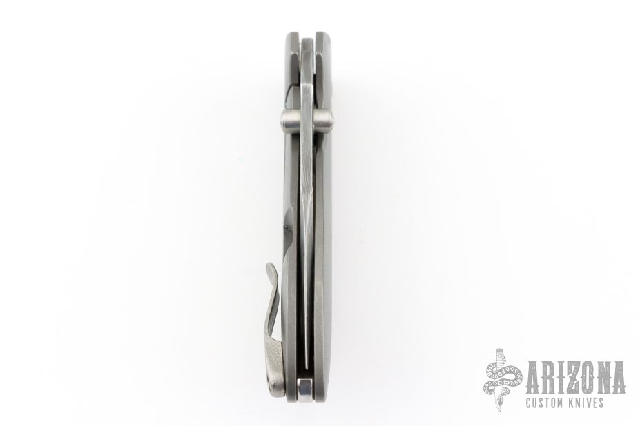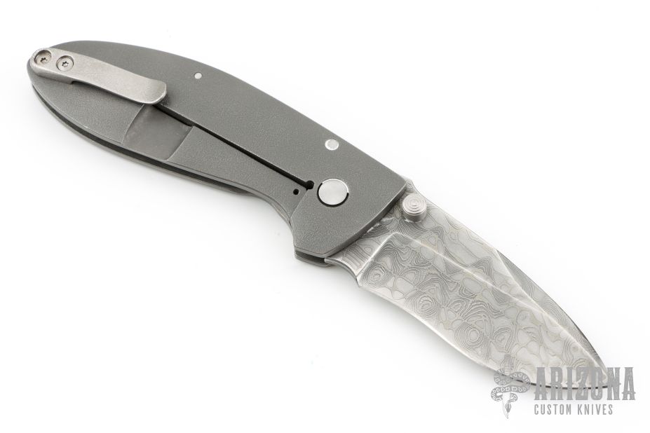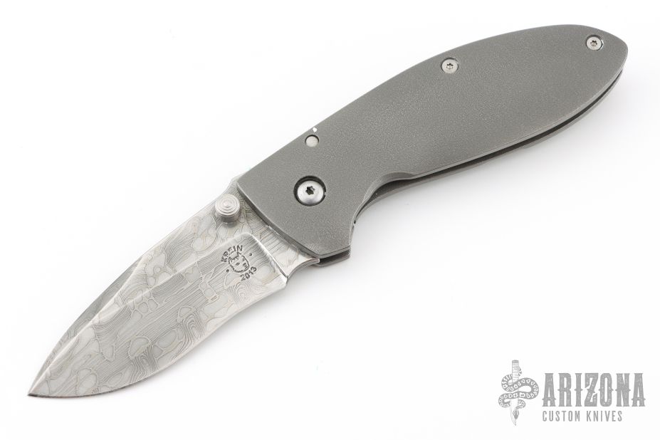 This Alpha framelock from Tom Krein features a drop point recurve Damascus blade with swedge and dual thumb studs. The handle an orange peel and acid wash finished titanium frame, Damascus backspacer, orange peel finished titanium tip up clip. Marked 2013 on blade. Rides on bearings, nice detent, lockup and blade seating. Has some light scuffs and scratches, as well as some buffing compound/wax in some creases. Great condition otherwise.