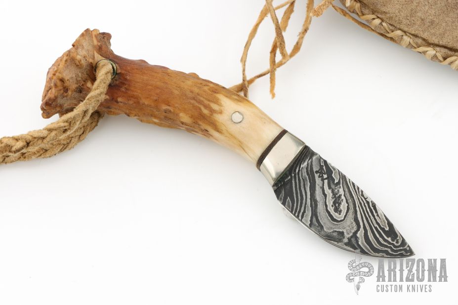 This knife by Daniel Winkler features a Damascus drop point blade with .103" blade stock and .786" blade depth, hidden tang construction. There is decorative file work on the blade spine. The handle has a nickel silver collar and pinned crown stag grip with lanyard hole/lanyard. Comes with basic Shook sheath, COA, and Knife Purveyor printout from previous sale. The knife has some scratches, scuffs and patina. Great condition otherwise.