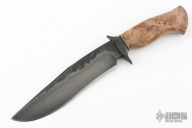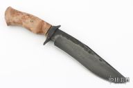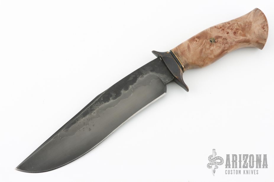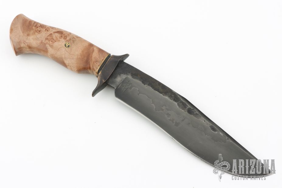 This Bowie by Dark Timber Knives features a darkened blade with a false top edge, visible hamon, forge finished flats, .253" blade stock and 1.804" blade depth, hidden tang construction. The handle has a distressed brass guard, curly maple grip with single pin. Has some patina and scuffs, excellent condition.