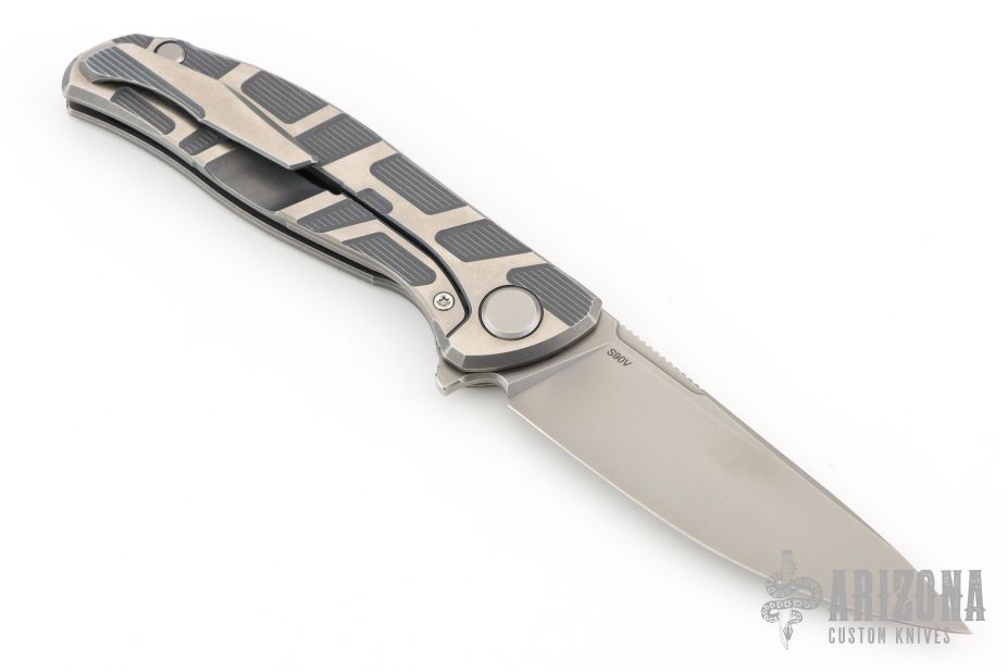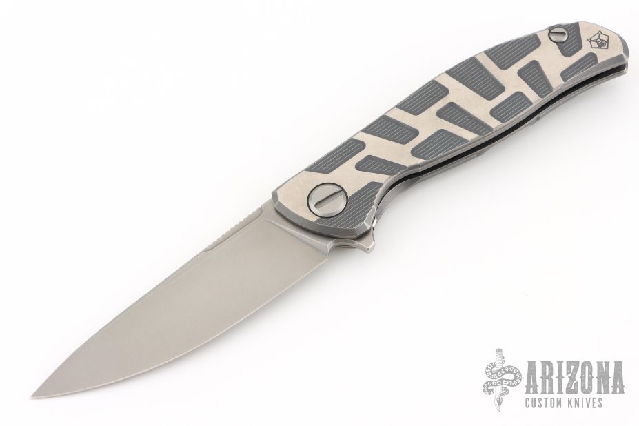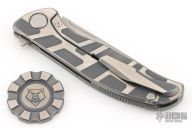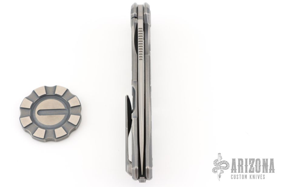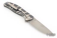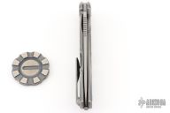This F95T by Shirogorov Knives features a stonewashed blade with a notched thumbrest and flipper. The handle has a two-tone milled titanium frame with matching titanium backspacer and tip up clip. Nice detent, lockup and blade seating. Has MRBS. Comes with original leather case and COA #33.  Excellent Condition.