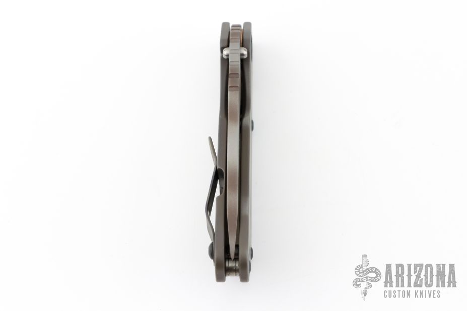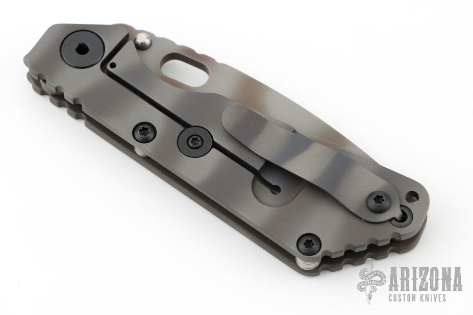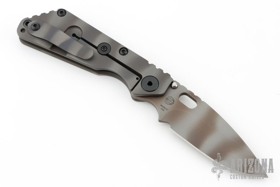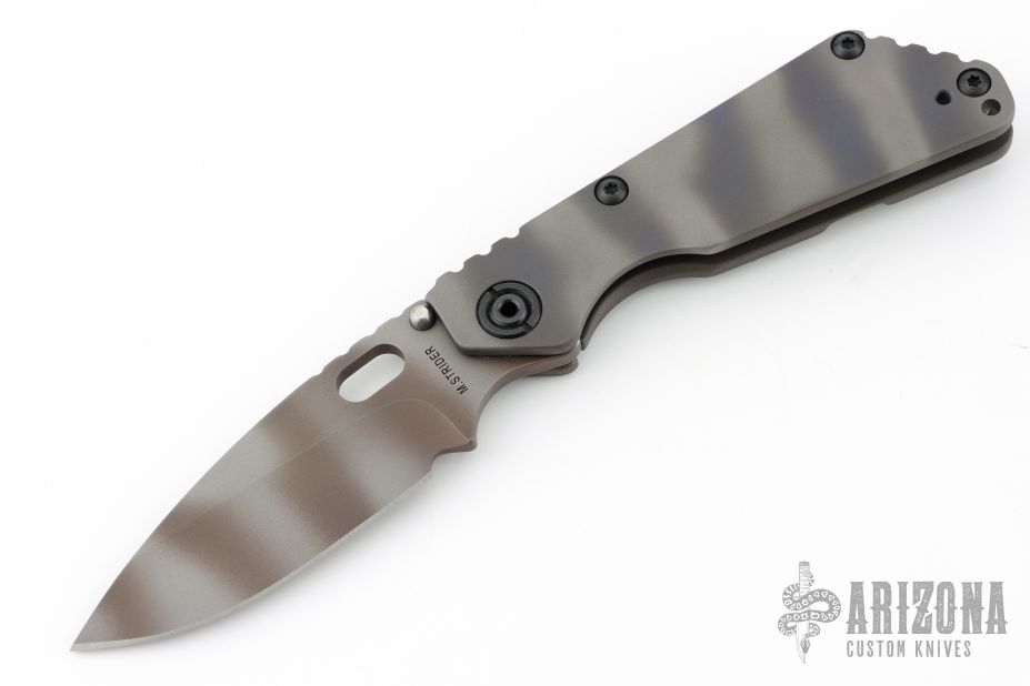 This SNG framelock folder by Mick Strider features a ghost stripe blade and a stripe finished titanium frame and tip up titanium clip. Includes a "Lock Bar Stabilizer" for maximum reverse lock retention. Nice detent, lockup and blade seating. Excellent Condition.
