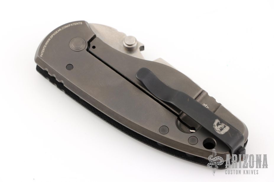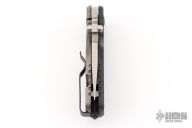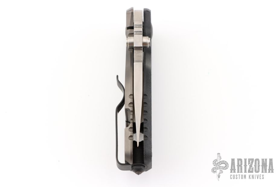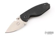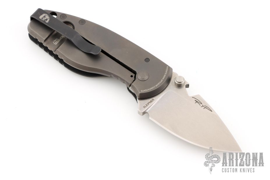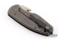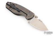 This HEAT/ F Plain Edge Framelock Folder has an acid etched drop point blade with dual thumb studs, bottle opener, and a notched thumbrest. Handle is black G10 and gunmetal titanium, with a matching stainless steel tip up clip and removable glass breaker, lanyard hole. Has a couple light scuffs, excellent condition otherwise.