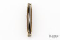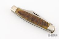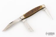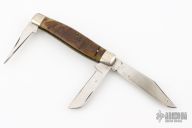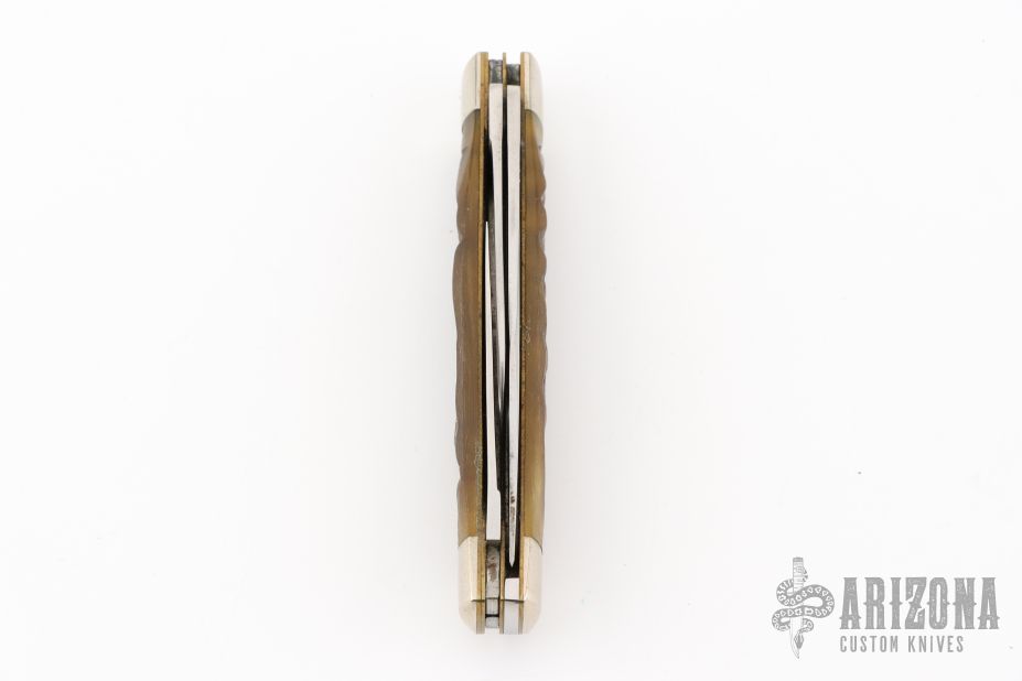 This Rat knife by Ontario Knife Company features polished blades with nail nicks. The handle has nickel silver bolsters and ram horn covers over brass liners.  Steel backsprings. Comes in original box. Has some light scratches, and patina great condition otherwise.