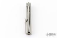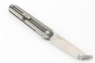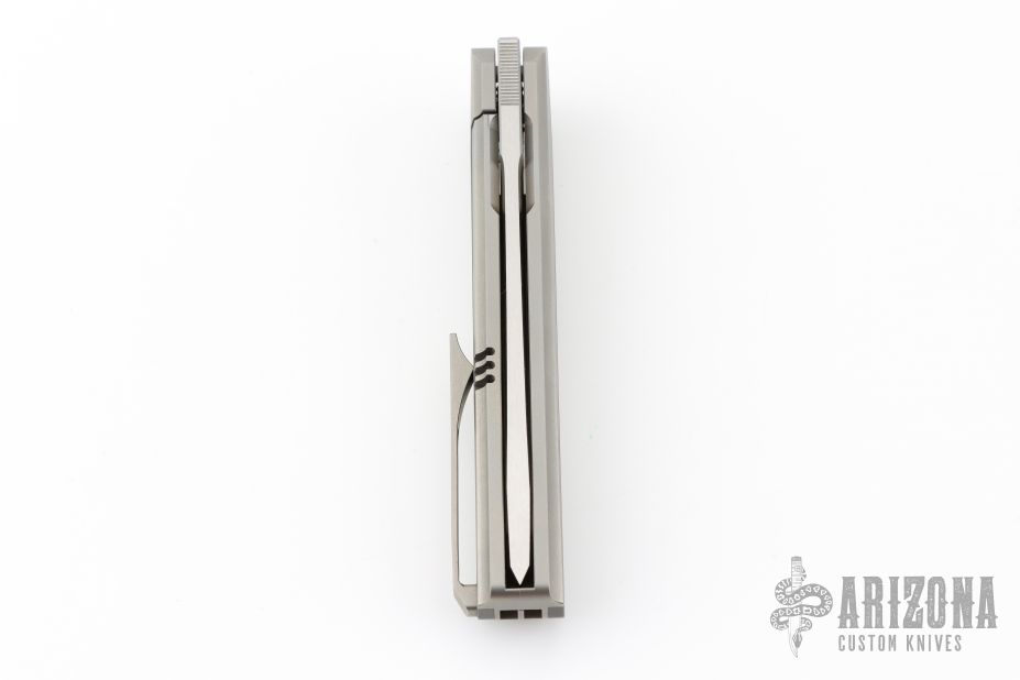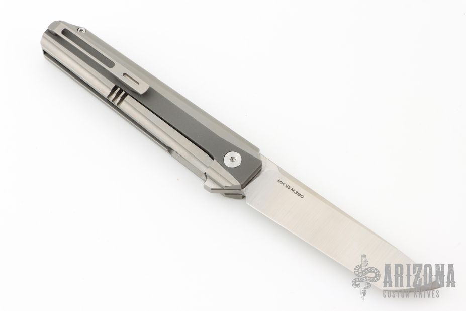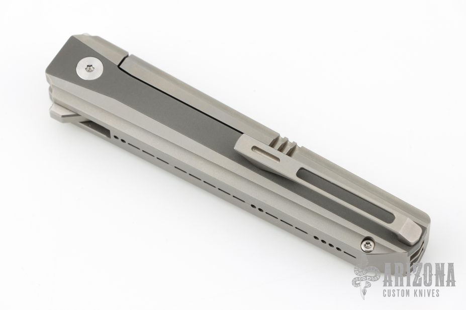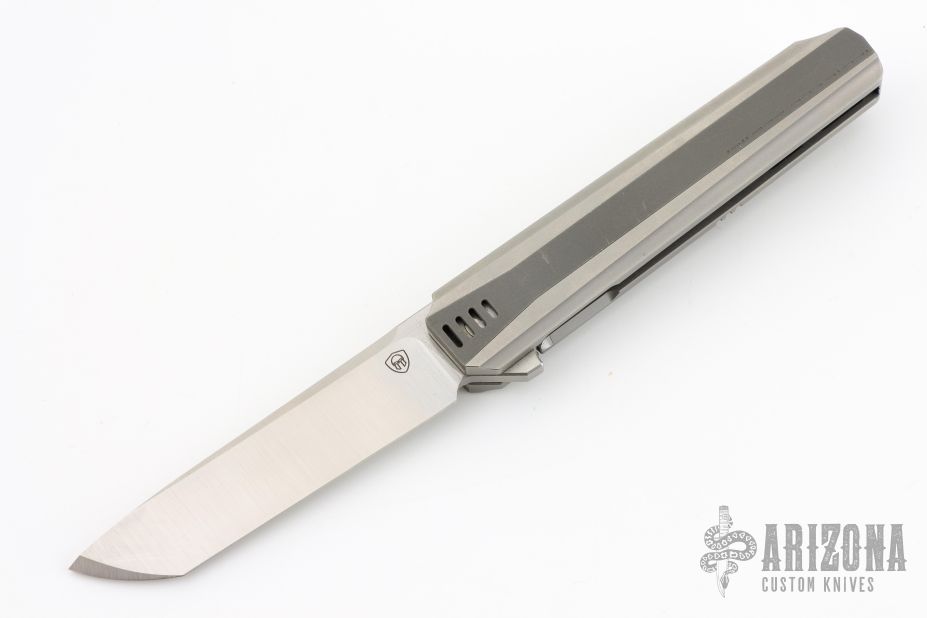 This knife features a satin finished tanto style blade. The handle has a bead blasted titanium frame with a matching tip up pocket clip. Has some light scratches on the frame otherwise the knife is in good condition.