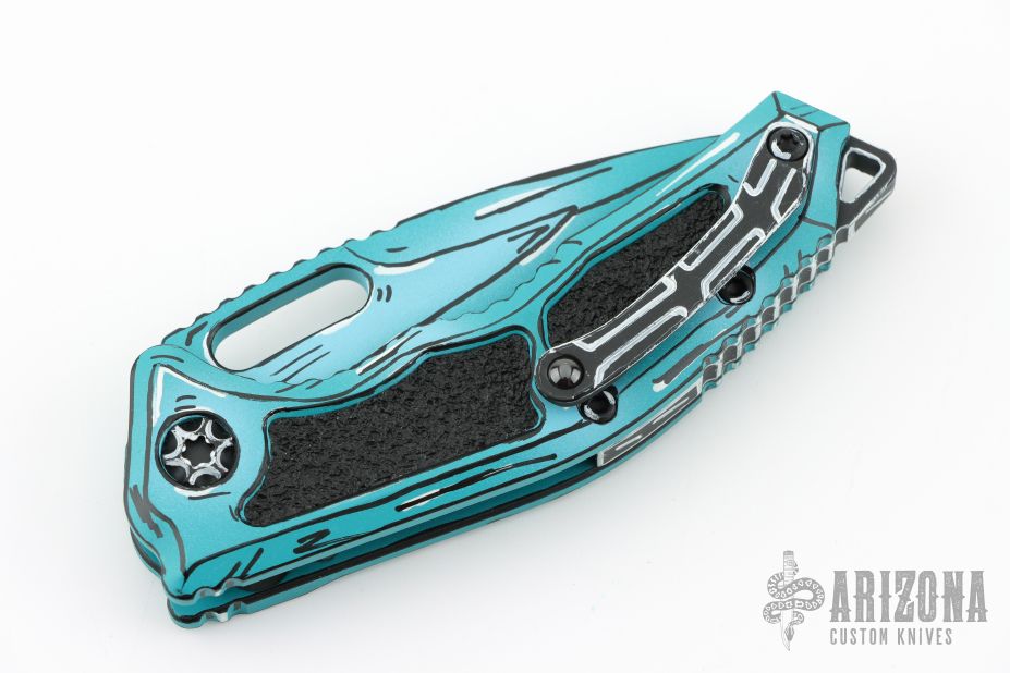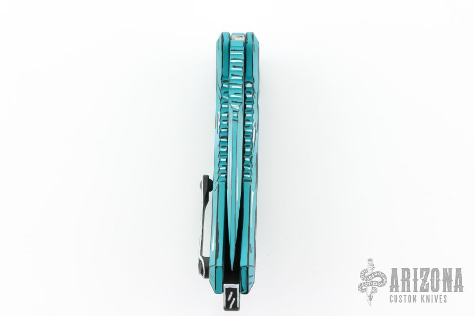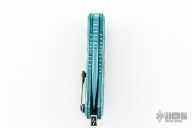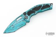 This Medusa by Heretic Knives features a blue recurve blade with false top edge and notched thumbrest. The handle has a blue aluminum frame with checkered push button, black/white backspacer and a tip up stainless steel clip with ball. Comes with original box and drawstring pouch. Excellent condition. Dated 02/2025 and s/n 00376