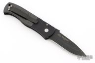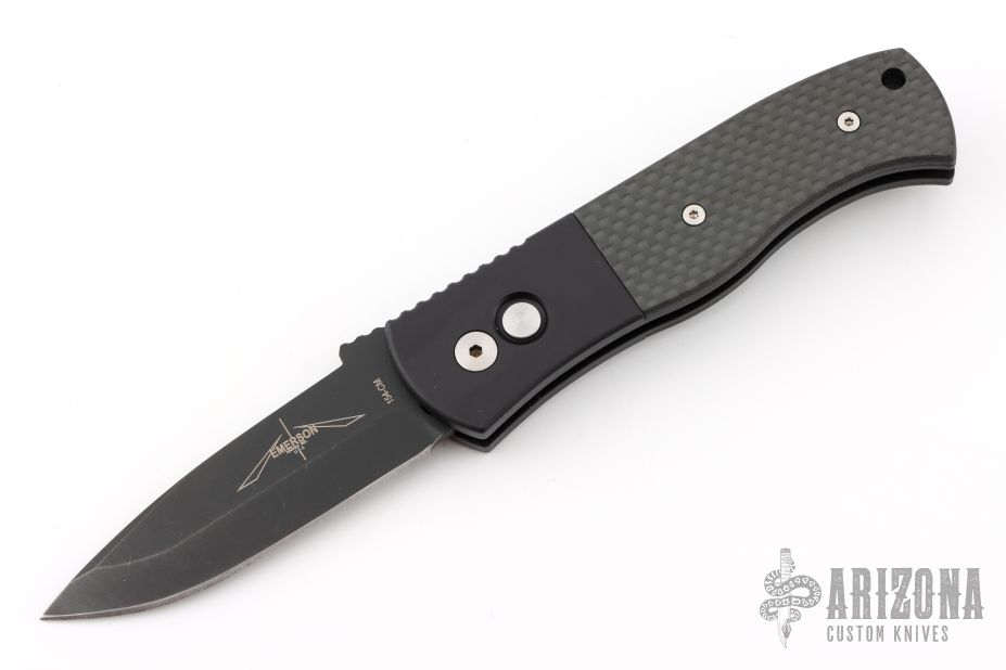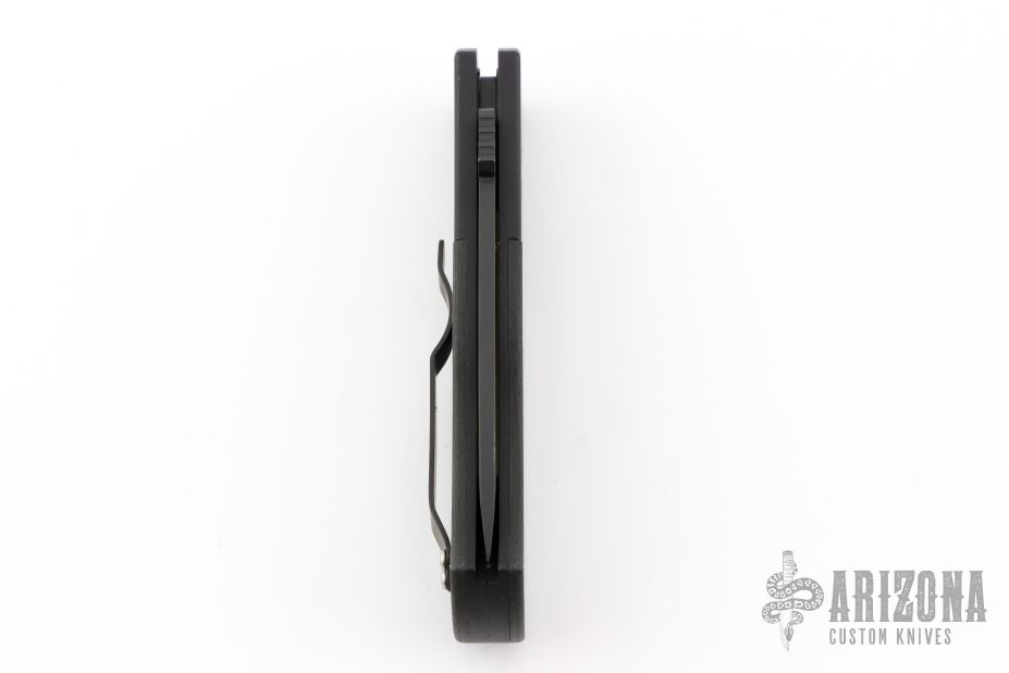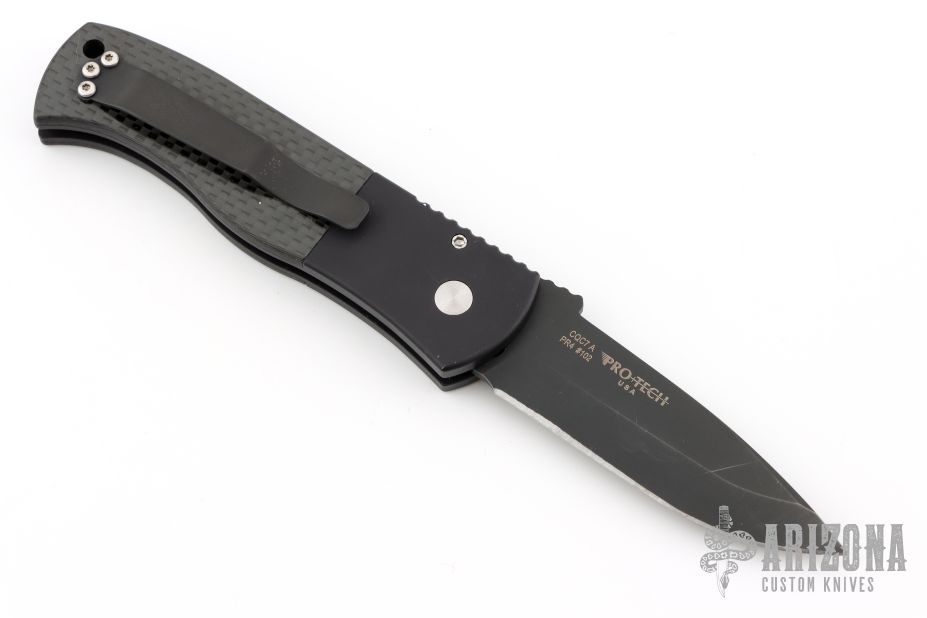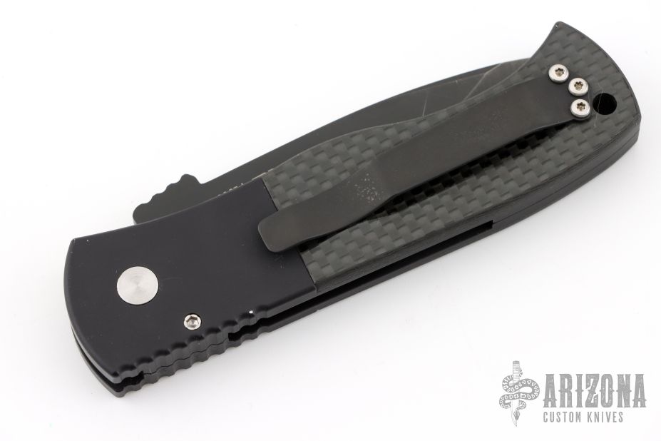 This CQC7 A Side Opening Auto has a black finished 154-CM drop/ spear point blade with swedge and notched thumb rest. Handle is black aluminum with carbon fiber overlays and lanyard hole. Black stainless steel clip is tip up. Has a few scuffs and scratches, great condition otherwise.