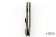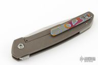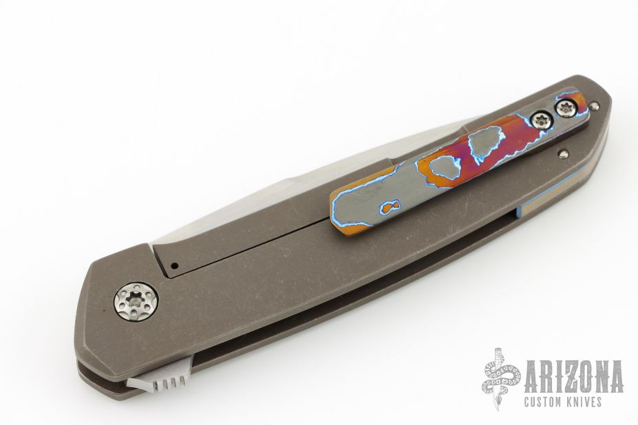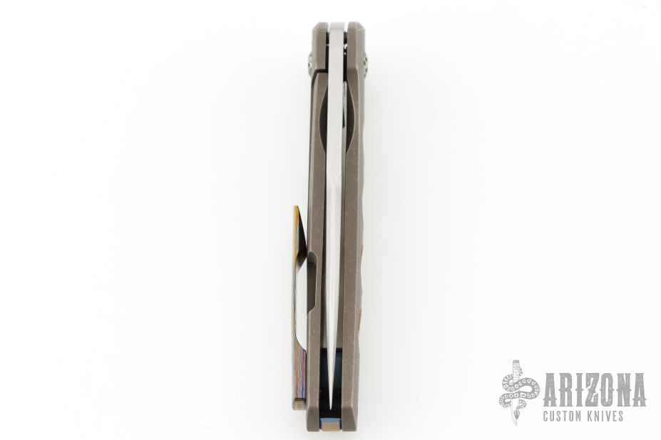 This Cobra Flipper by Enrique Pena features a hand rub satin finished drop point blade with swedge, notched thumbrest and flipper. The handle has a titanium frame with ZircuTi tip up clip. Nice detent, lockup and blade seating. Comes with Maker's zippered case. Excellent condition.