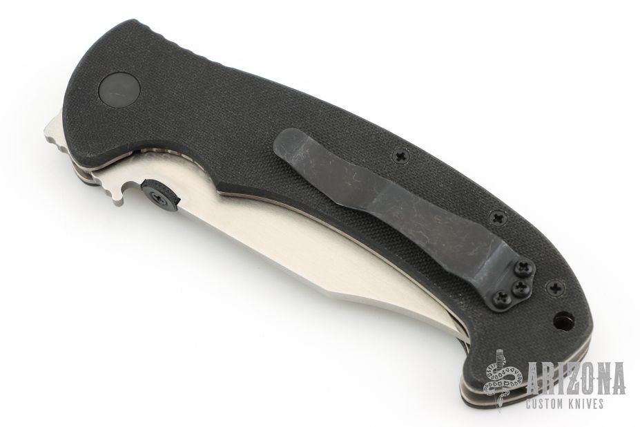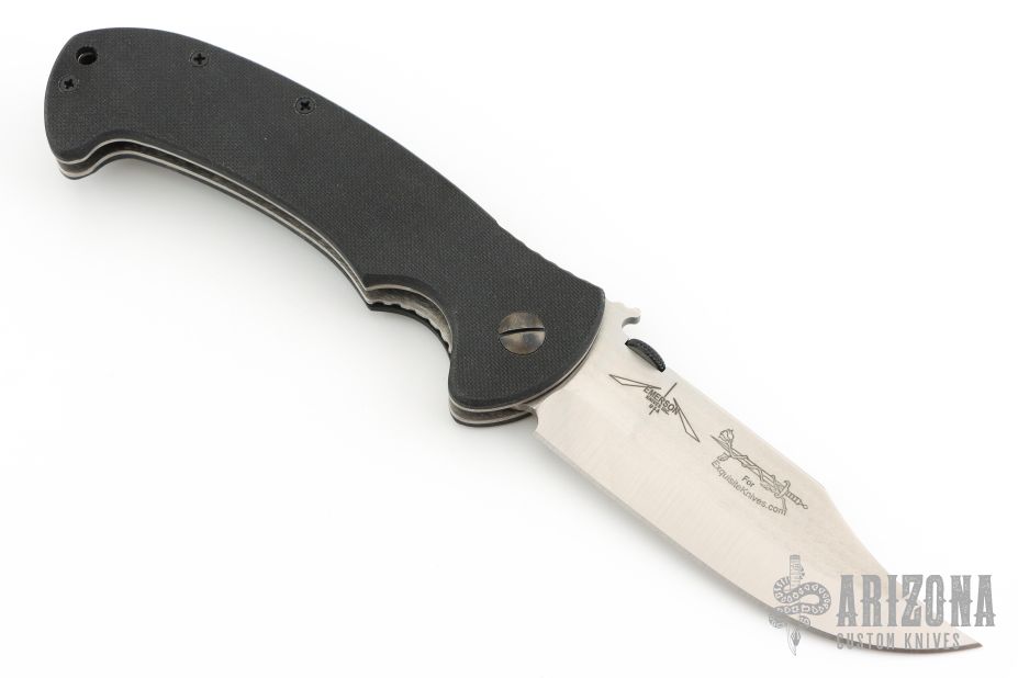 The CQC-13 is the first Bowie style folder from Emerson. Includes the patented Wave feature and knurled thumbdisc. The handle is comprised of black G10 scales, titanium liners, and a black G10 backspacer. Has a lanyard hole at the butt and black stainless clip positioned for tip up carry. Nice detent, blade seating and lockup. Made for ExquisiteKnives.com and is printed on the blade. Comes with original box. Excellent condition.