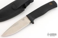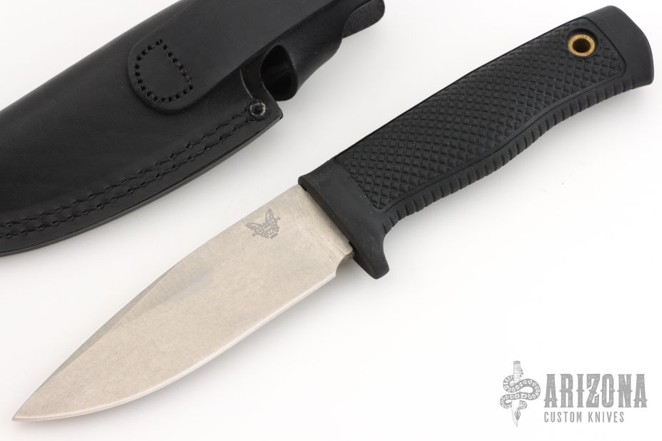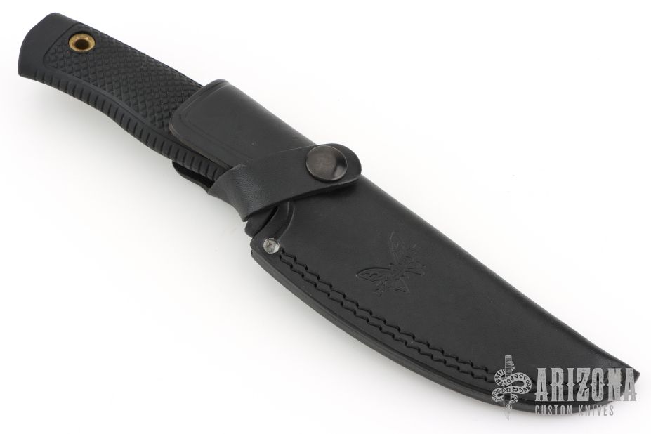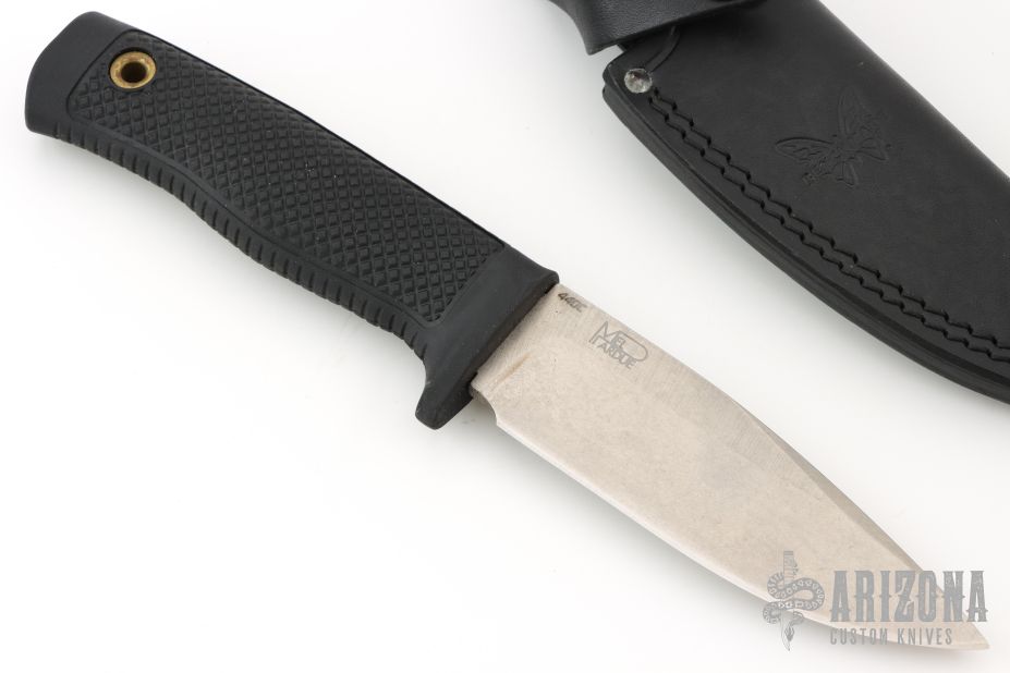 Here's an early production find for a Benchmade. This model 10502 Rant II Bowie .174" blade stock and 1.298" blade depth, hidden tang construction. Mel Pardue design. Sure grip rubber textured handle and lanyard hole in pommel. Great day hiker or even a large EDC. Comes with original black leather sheath. Has a couple light scuffs, otherwise Excellent condition.