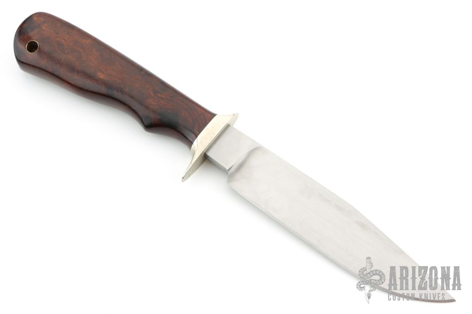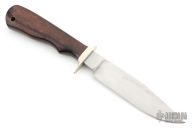 This knife by Journeyman Smith Rob Patton features a hand rub satin finished blade with a hamon and false top edge, .204" blade stock and 1.011" blade depth, hidden tang construction. The handle has a nickel silver guard, and desert ironwood grip with lanyard hole in pommel. Has a couple light scratches, excellent condition otherwise.
