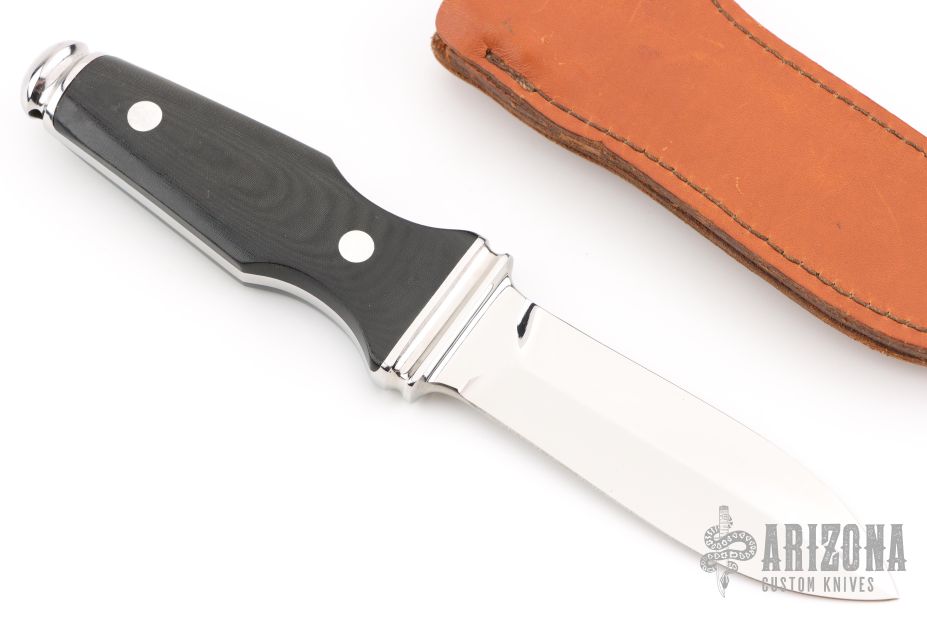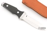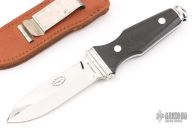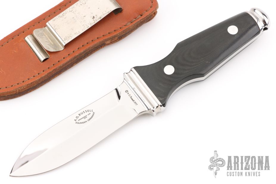 This is a very attractive boot knife from AG Russell. This is the older model made in Solingen, Germany. Blade is .099" thick and .908" deep at the ricasso and double-edged. Scales are black linen micarta. Integral construction with aluminum pins. Comes with brown leather sheath with metal clip. Has some light scuffs and scratches, excellent condition for its age and otherwise. Dated 1977