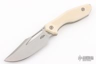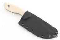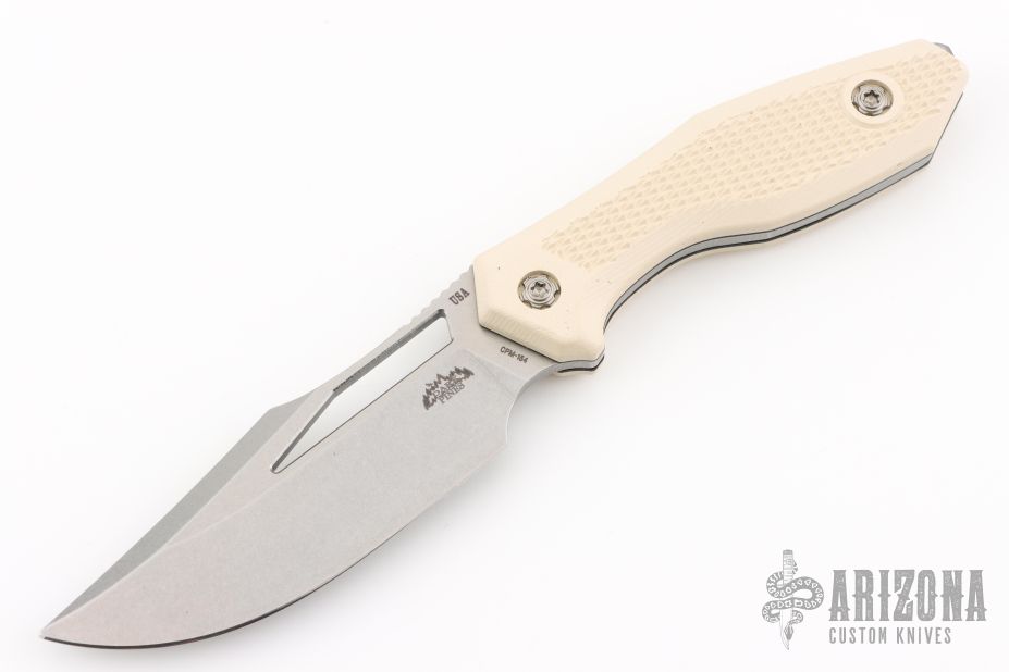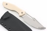 Handle scales are machined from white paper micarta. They are secured to the full tang with torx screws made by TiConnector. The scales can be removed for easy cleaning and maintenance. The tang extends past the scales to create a glass breaker that doubles as a lanyard hole. The handle is exceptionally comfortable when choking up on the blade using the choil or held further back for more leverage.