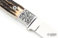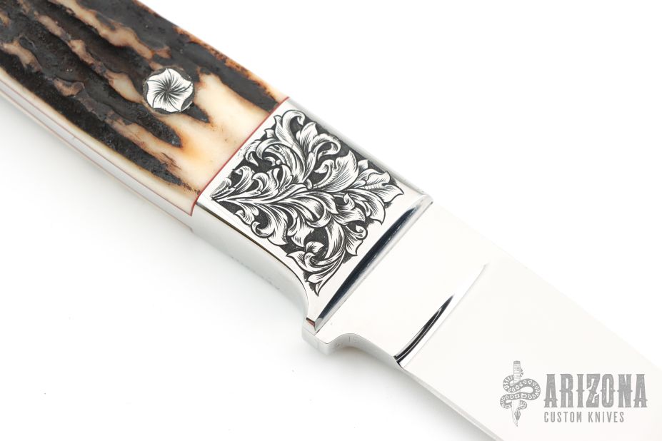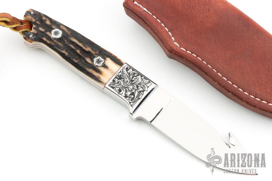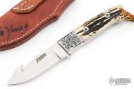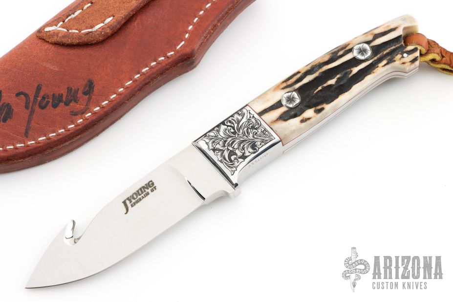 This Gut Hook Skinner by John Young features a mirror polished blade with gut hook, .206" blade stock and 1" blade depth, full tapered tang construction. The handle has a mirror polished stainless guard, stag scales and red liners. Lanyard hole at butt. Comes with brown leather sheath. The bolsters and pins have been engraved by Alice Carter. Excellent condition.