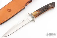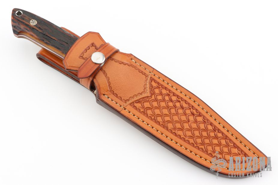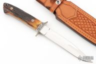 This Loveless Style Fighter by Chad nell features a mirror polished clip point blade with a false top edge, .204" blade thickness and .871" blade depth, full tapered tang construction. The handle has a stainless steel guard that has been engraved with gold inlays by Julie Warenski, stag scales with thin red liners, engraved and gold inlaid stainless steel pins, has a lanyard hole. Excellent fit and finish. Comes with a hand tooled brown leather sheath by Paul Long. Excellent condition.