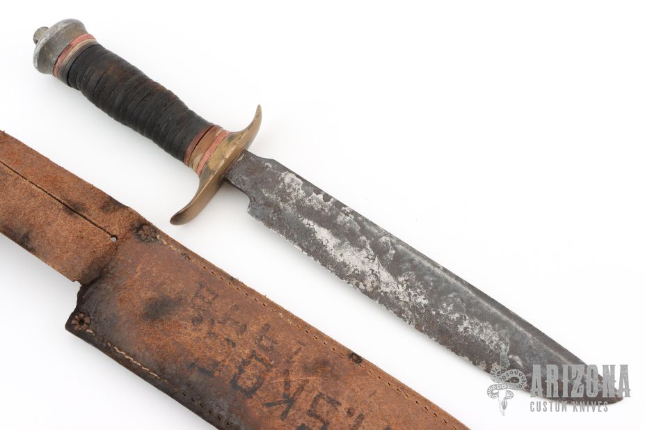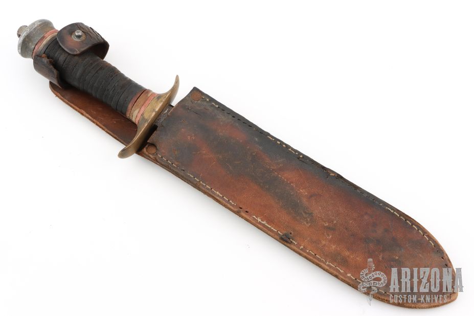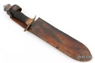 The Model 1 by Randall Made Knives was made famous by Allied combat troops in World War II and since widely used in all theaters of war. This knife has an 8" tool steel blade with a false top edge. .236" blade stock and 1.250" blade depth, hidden tang construction. The handle has a brass hilt, and a stacked leather handle with duralumin butt cap and red spacers. Comes with brown leather sheath that is not original to the knife, and has "R.M. SKOE. 1948" on the back, I think it says 1948. Has been used and carried. Has lots of oxidation and pitting on the blade, looks like it was left in the ground for a while, the leather spacers have shrunk and there is gaps between the spacers. VERY RARE, only approximately 1200 made between 1943-1945. Poor condition for its age.