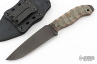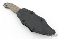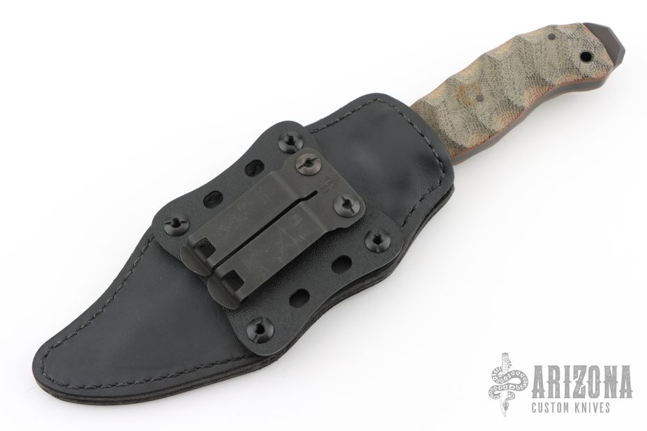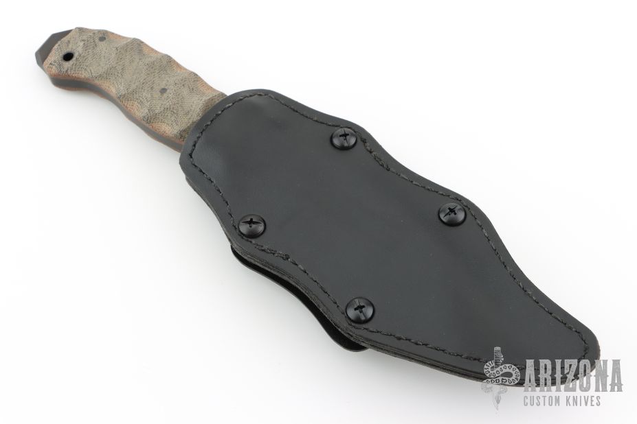 A custom Kydex-lined black leather sheath comes with this knife and compliments the all-black fixed blade. The sheath allows for multiple carry positions and fixtures. A feature of the sheath is that the knife can be drawn with little to no noise. The sheath combines the best of leather and Kydex into a truly functional rig.