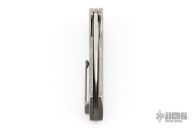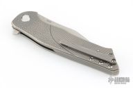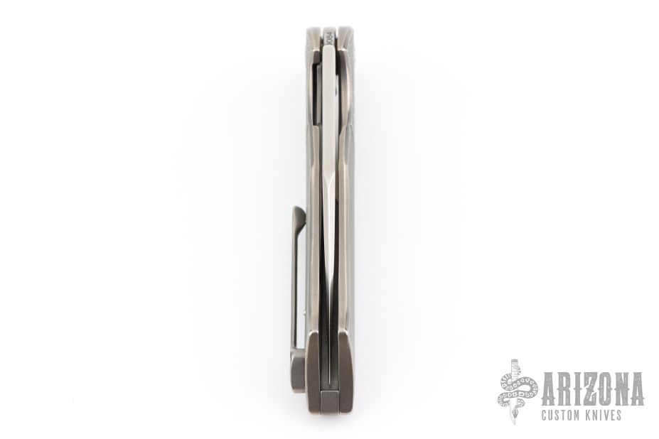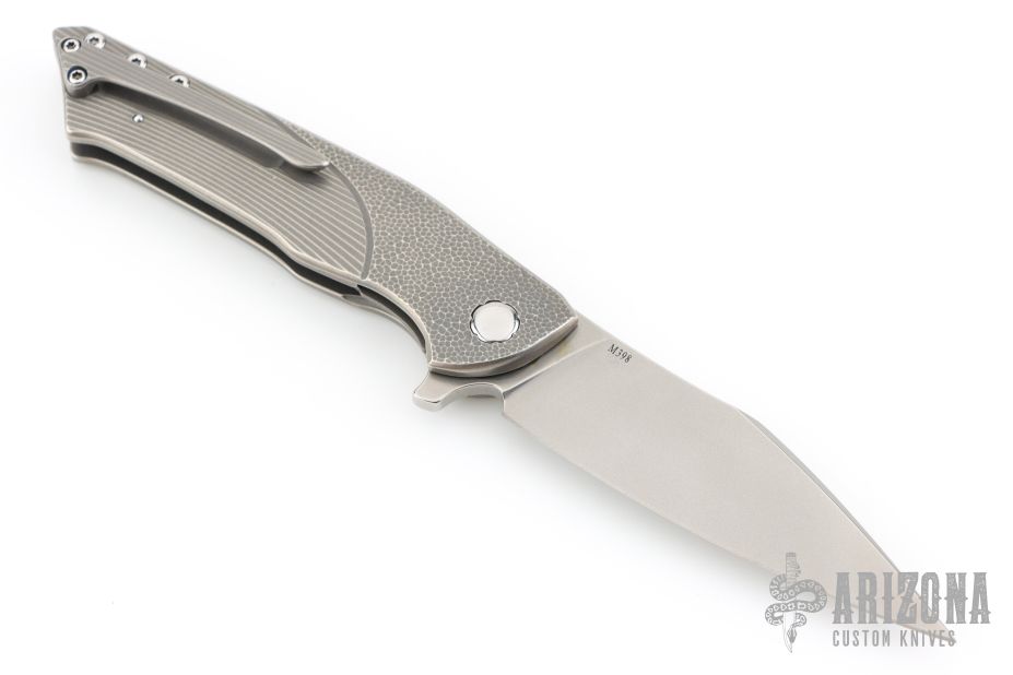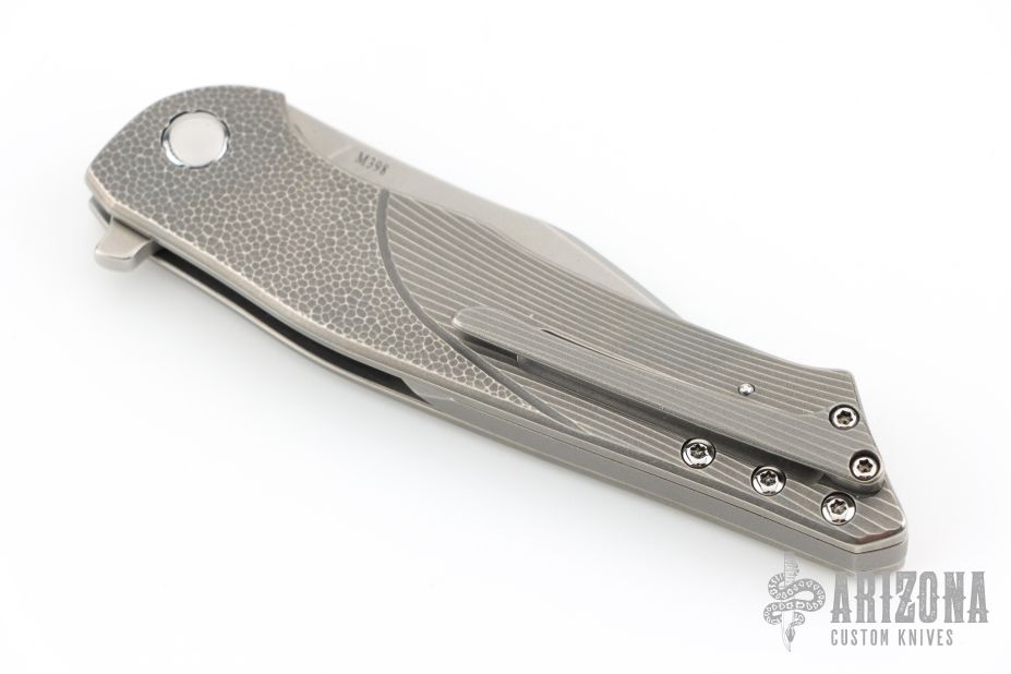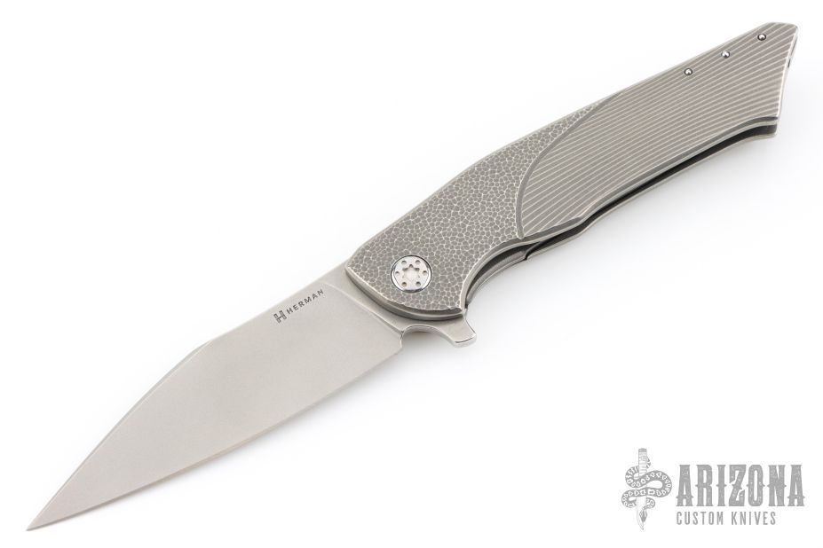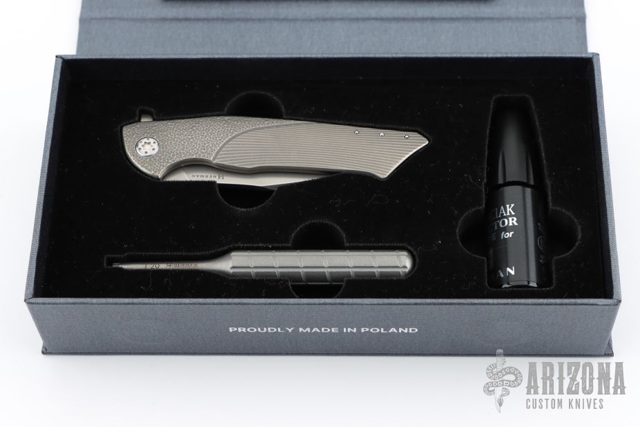 This Folder Bee Flipper by Herman Knives features a tumbled blade, notched thumb rest, and flipper. The handle has a milled and textured titanium frame with titanium liner, tip up clip and backspacer. Nice detent, lockup and blade seating. Rides on bearings. Comes with original, box, COA dated 7/3/25 #0084, and tool. Excellent condition.