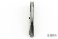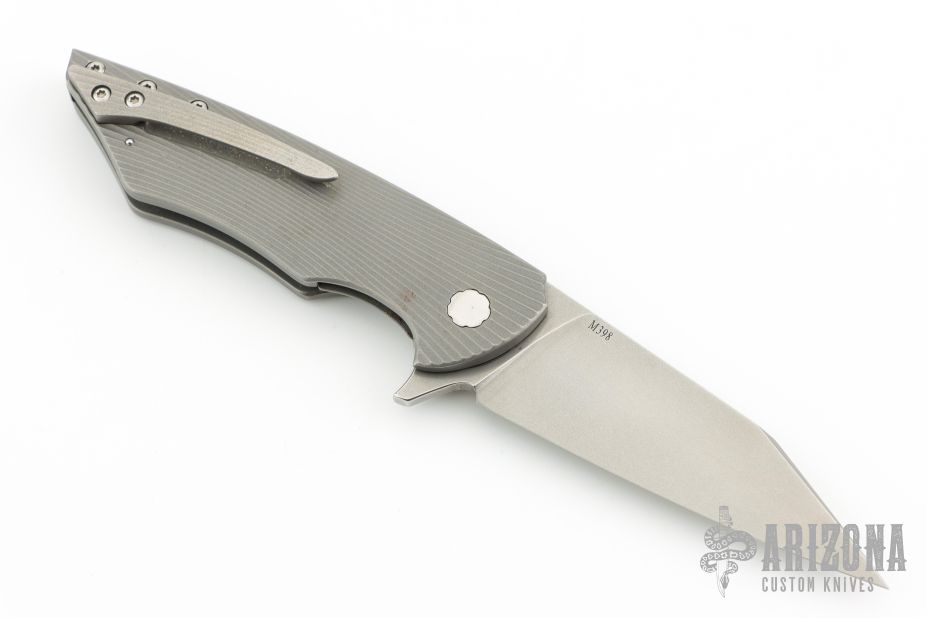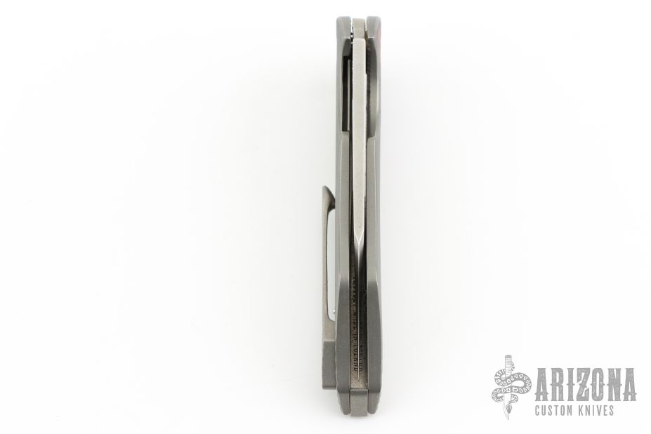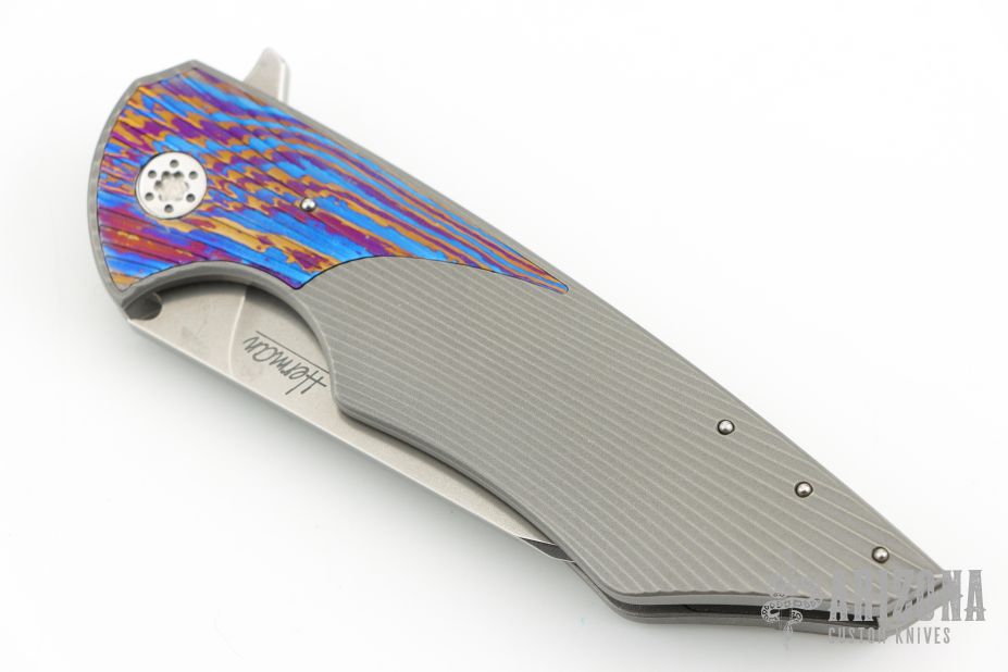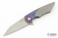 This Vespertilio Flipper by Herman Knives features a stonewashed blade with flipper. The handle has a milled titanium frame with Timascus inlaid bolster, titanium liner, and tip up titanium clip and backspacer. Nice detent, lockup and blade seating. Rides on bearings. Excellent condition. Comes with original zippered case, COA and pivot tool.